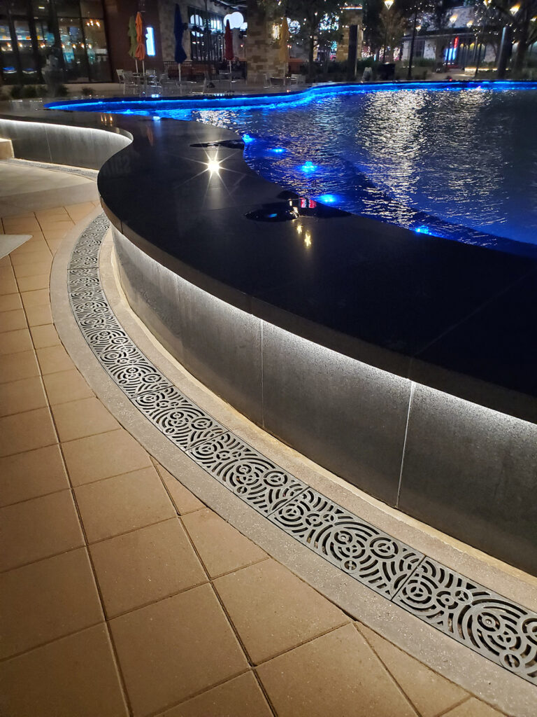Oblio 9″ wide radius trench grate, cast iron with “antique bronze pearlescent” powder coat finish. DESIGN: The Olsson Studio. INSTALLER: Gold Medal Pools. PROJECT: Grandscape. LOCATION: The Colony, TX.