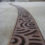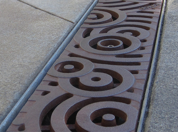 Oblio 5″ wide radius trench grate, raw cast iron, arrayed with various different radii. PROJECT: Fashion Place Mall. LOCATION: Salt Lake City, UT.