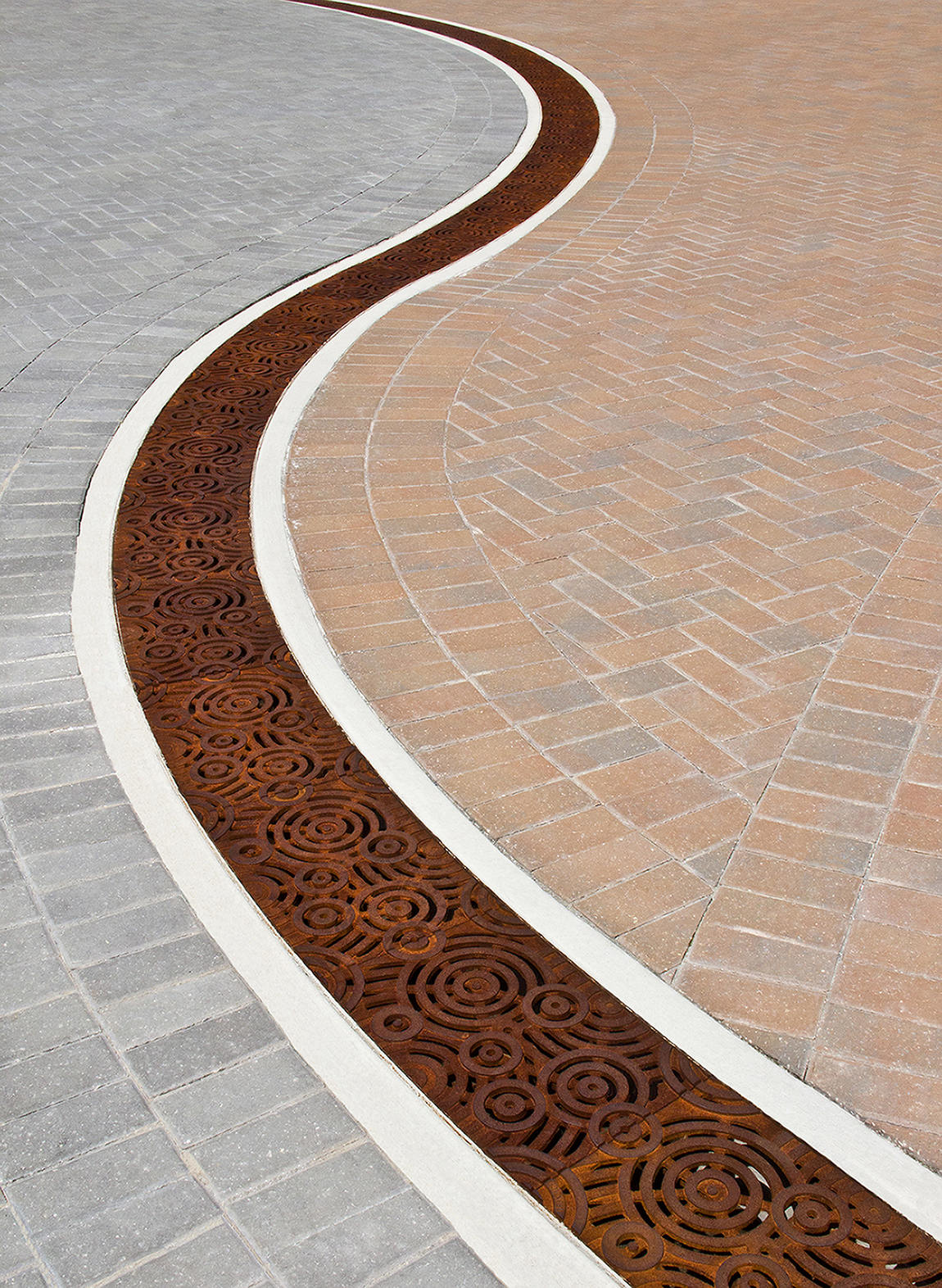 Oblio 5″ wide radiused trench grate, raw cast iron, arrayed with various radii. DESIGN: GGLO. PROJECT: 123 West. LOCATION: Friday Harbor, WA.