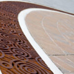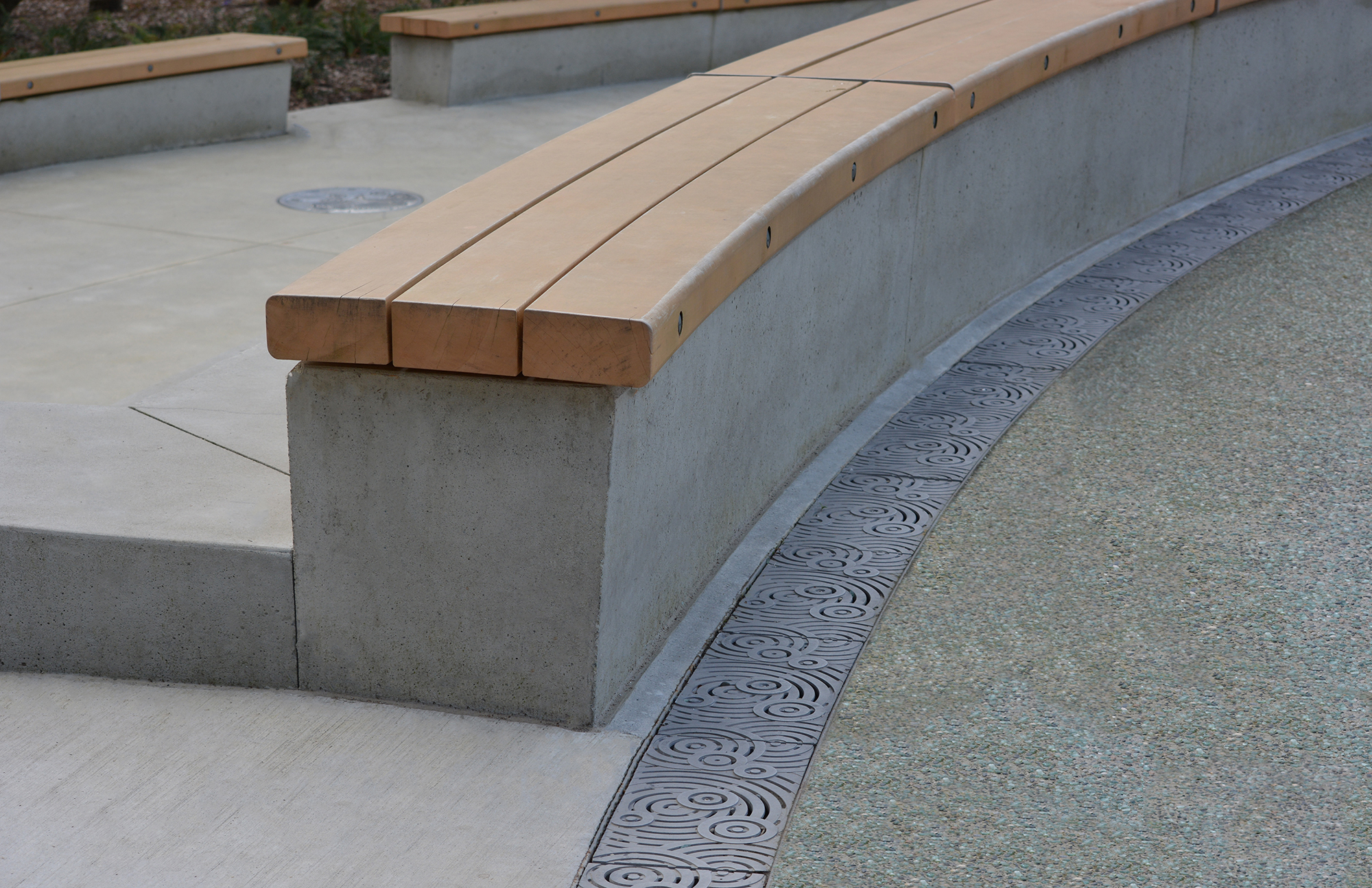 Oblio 5″ wide radius trench, raw cast bronze. DESIGN: SiteWorkshop Landscape Architecture. PROJECT: Wright Park. LOCATION: Tacoma, WA