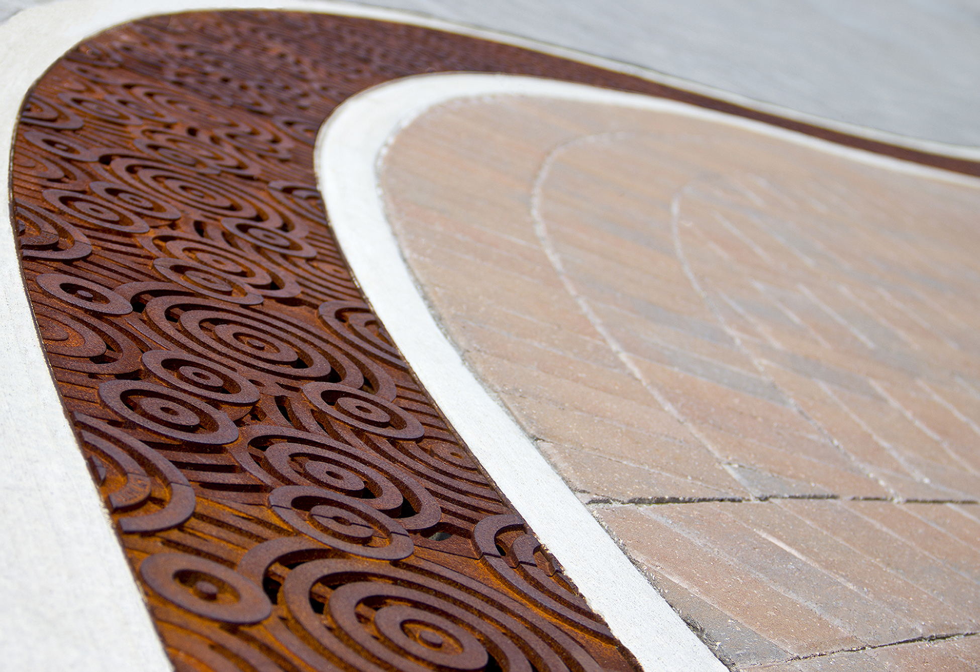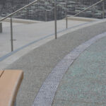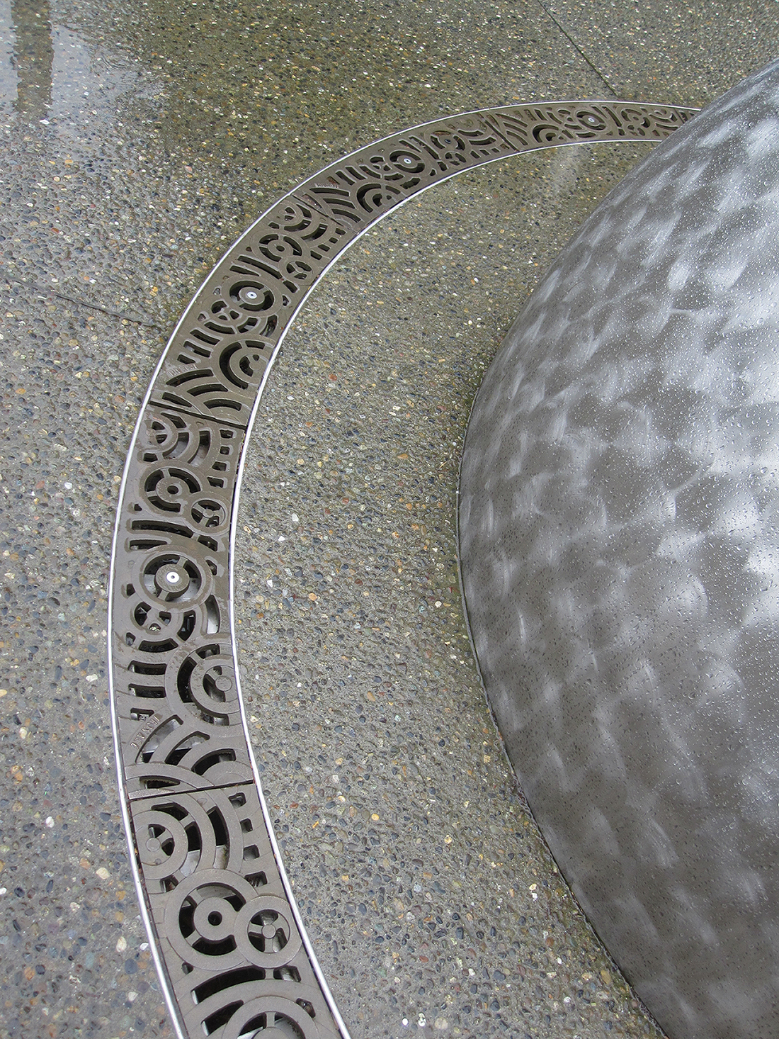 Oblio 9″ wide radius trench grate, raw cast aluminum. DESIGN: PWL Partnership. PROJECT: Vancouver Aquarium. LOCATION: Vancouver, BC, Canada.