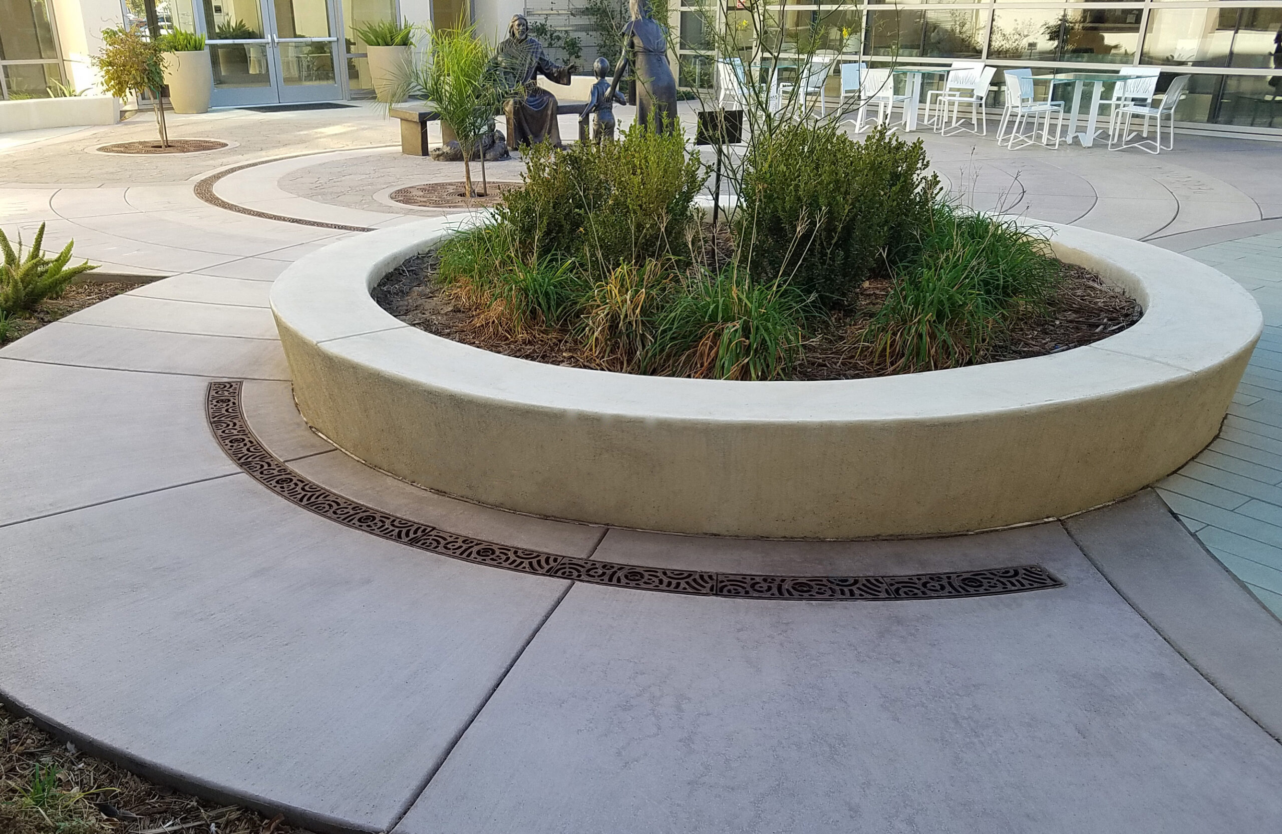Oblio 5″ wide (forefront) and 6″ wide (background) radius trench, pictured with custom 5′ dia. Oblio tree grates. Raw cast iron. DESIGN: RMM Design Group PROJECT: Adventist Medical Center. LOCATION: Hanford, CA.