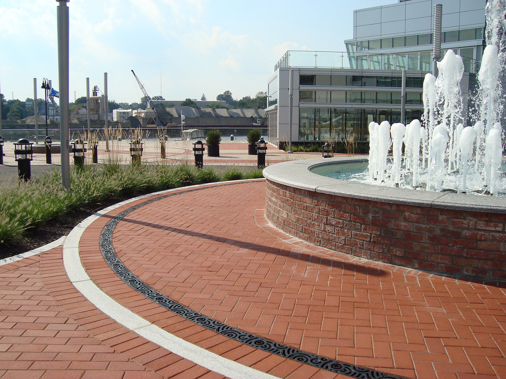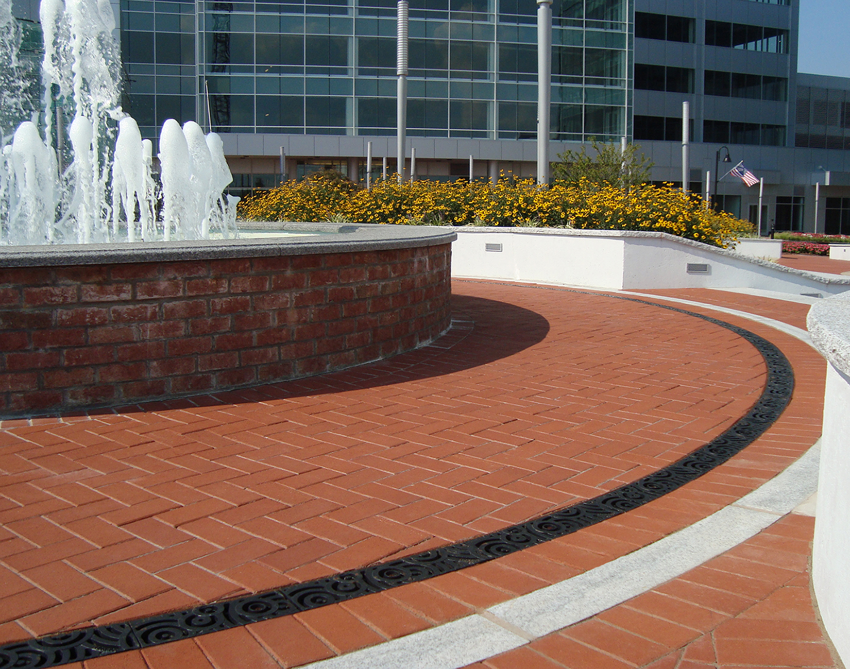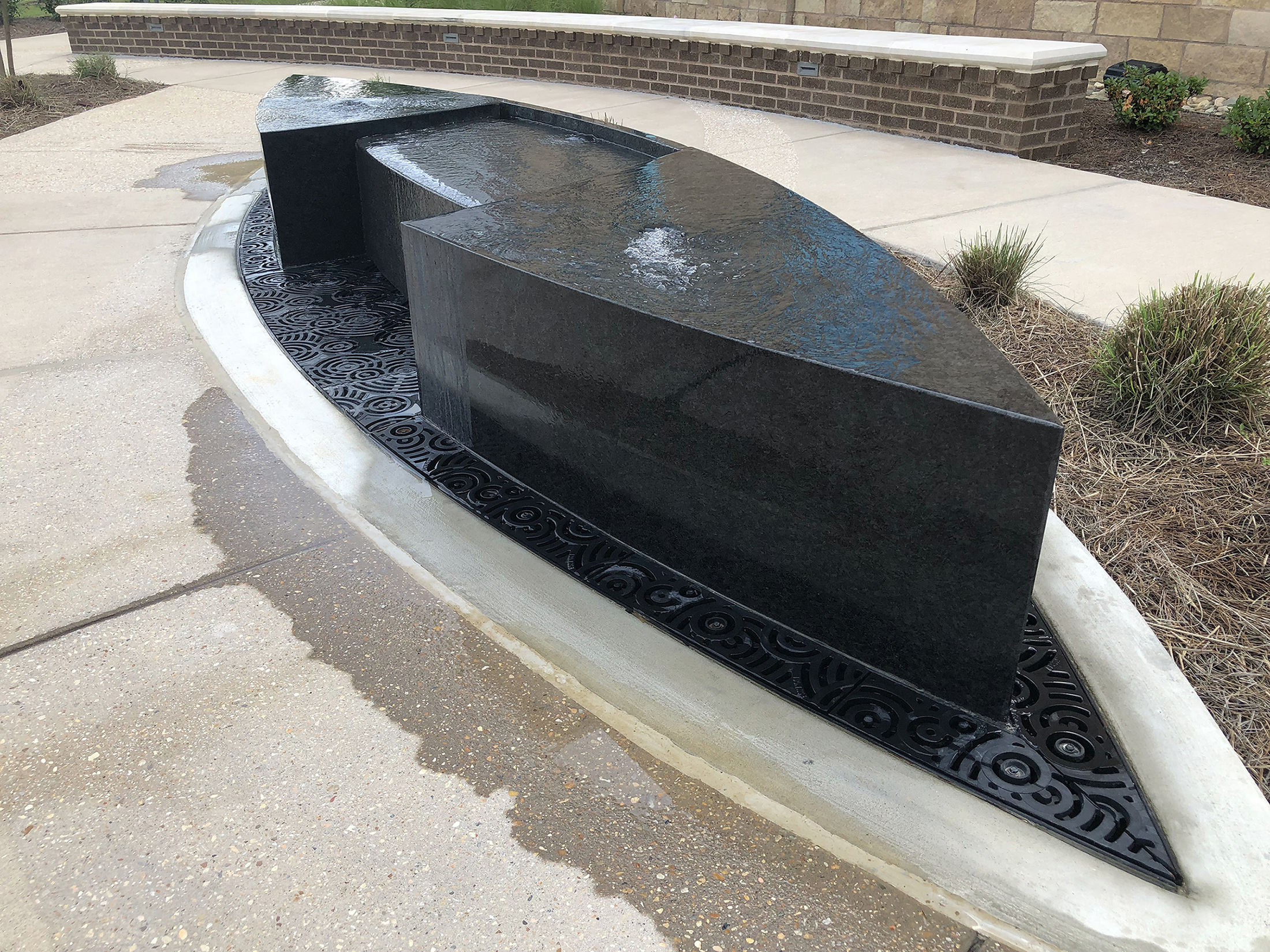 Granite arrival fountain with 5″ wide Oblio radius trench grates, cast ductile iron with e-coat + black powder coat finishes. DESIGN: TBG Partners. INSTALLER: Rotolo Consultants (RCI). PROJECT: Our Lady of the Lake Children’s Hospital. LOCATION: Baton Rouge, LA.