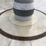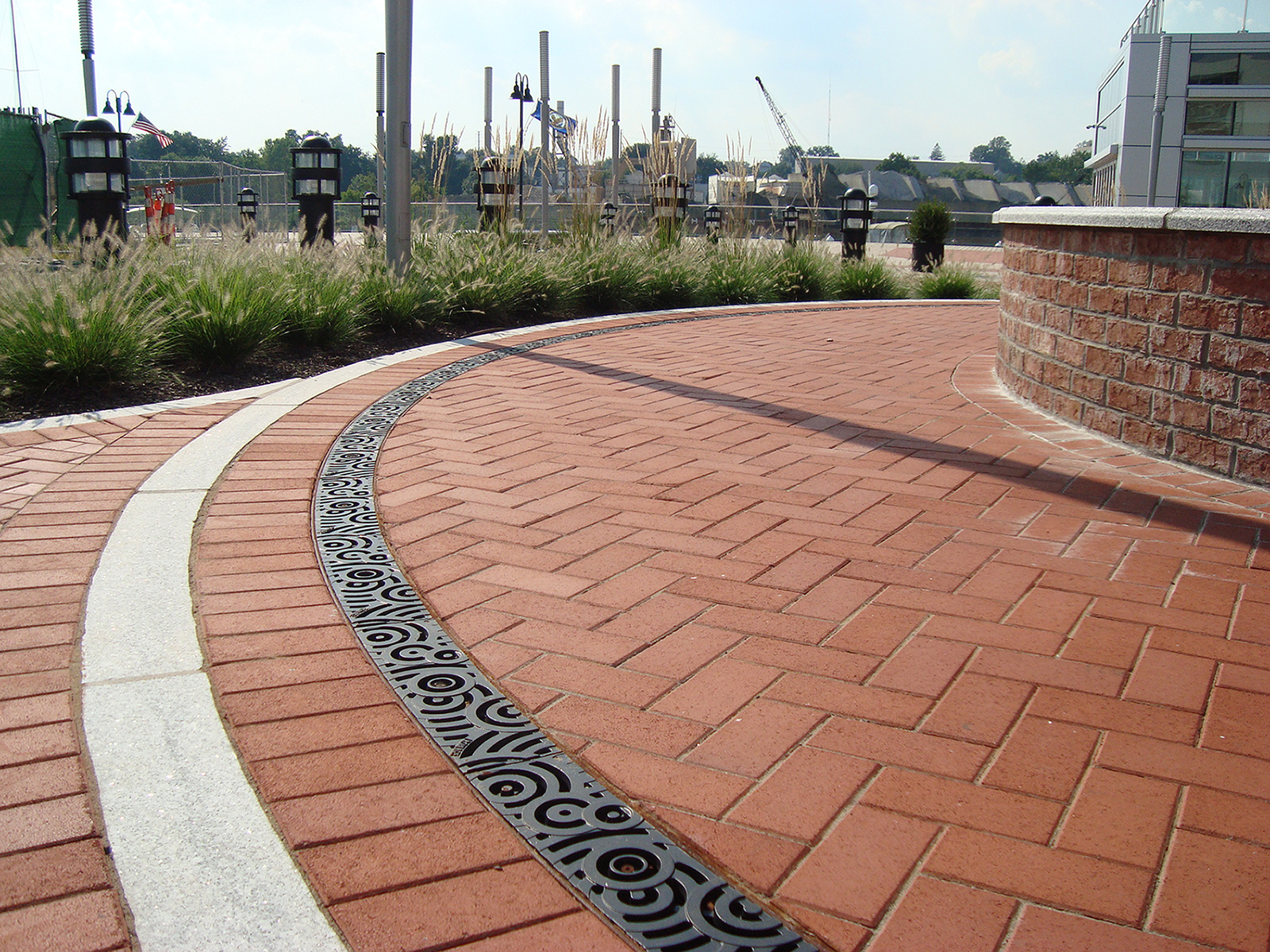 Oblio 5″ wide radius trench grate, raw cast iron. PROJECT: Stallings Fountain. LOCATION: Stallings, NC.