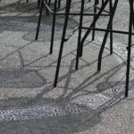 Oblio 5″ wide radiused trench grate, raw cast iron, arrayed with various radii. Also pictured is our Oblio 18″ x 24″ catch basin grate. DESIGN: GGLO. PROJECT: 123 West. LOCATION: Friday Harbor, WA.