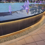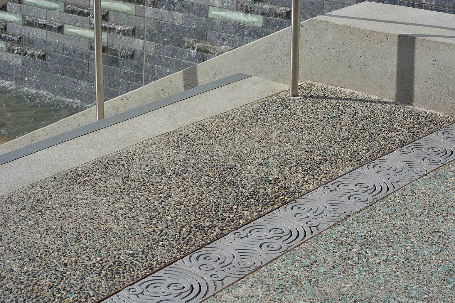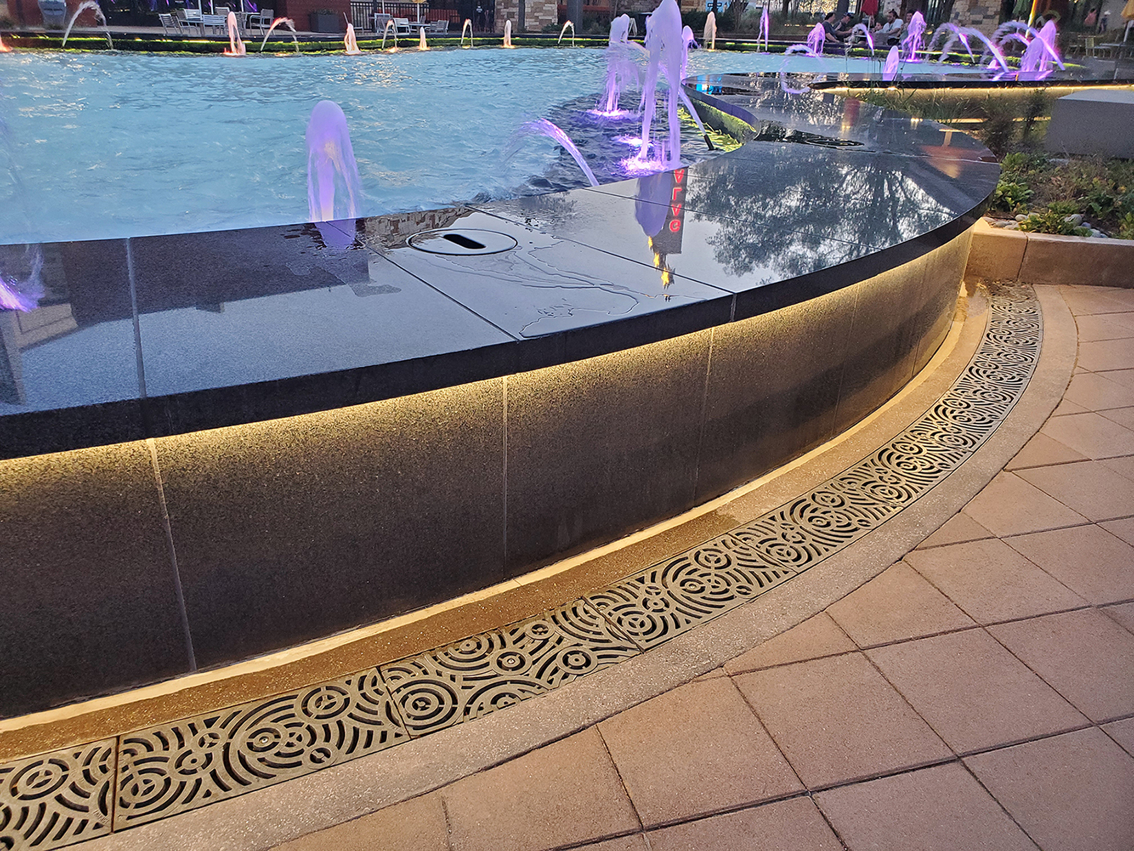 Oblio 9″ wide radius trench grate, cast iron with “antique bronze pearlescent” powder coat finish. DESIGN: The Olsson Studio. INSTALLER: Gold Medal Pools. PROJECT: Grandscape. LOCATION: The Colony, TX.