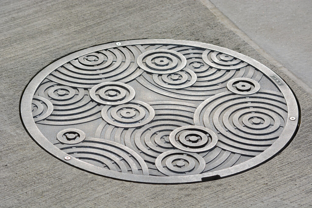 Oblio 25″ Dia. manhole cover, raw cast aluminum. DESIGN: PWL Partnership. PROJECT: Vancouver Aquarium. LOCATION: Vancouver, BC, Canada.