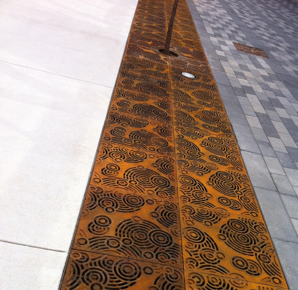 Oblio 4′ x 4′ tree grates used in conjunction with 24″ x 24″ Oblio grate panels to create a 4′ x 96′ tree grate array; raw cast iron.