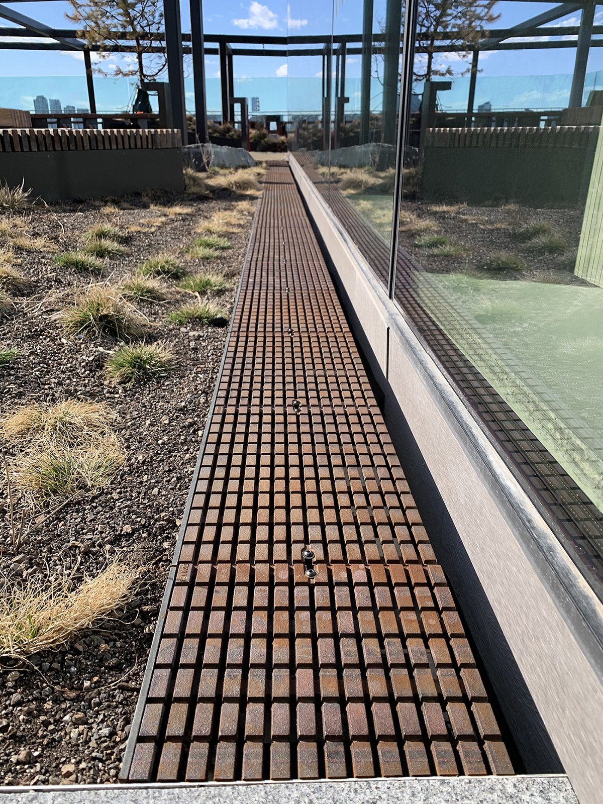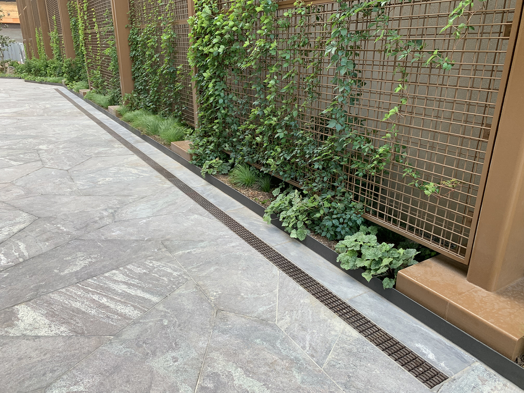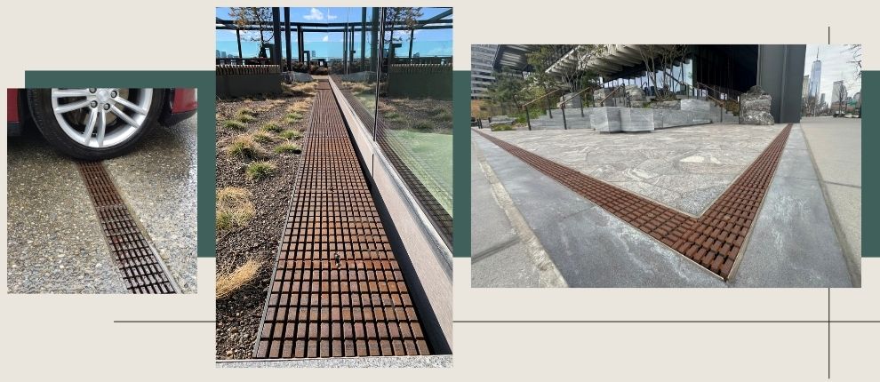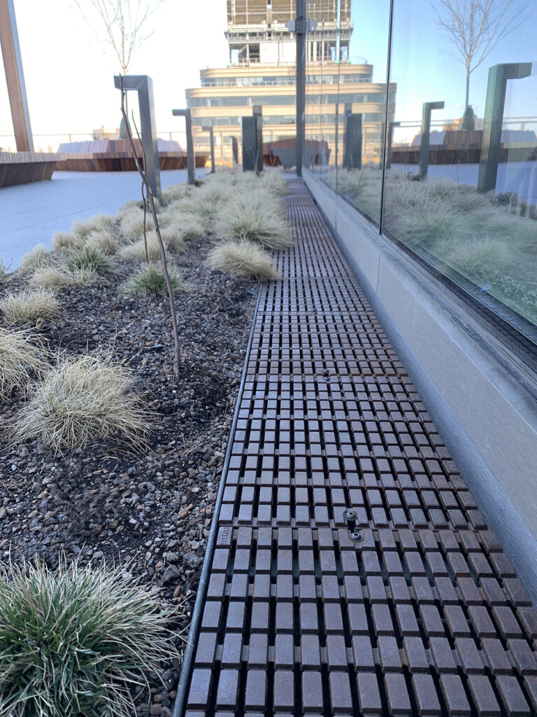 Plex 12″ x 18″ trench grate, cast ductile iron with baked-on-oil finish. DESIGN: Future Green Studio. INSTALLER: Blondie’s Treehouse. PROJECT: St. John’s Terminal, Manhattan offices for a large tech firm. LOCATION: New York, NY.