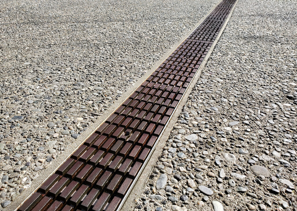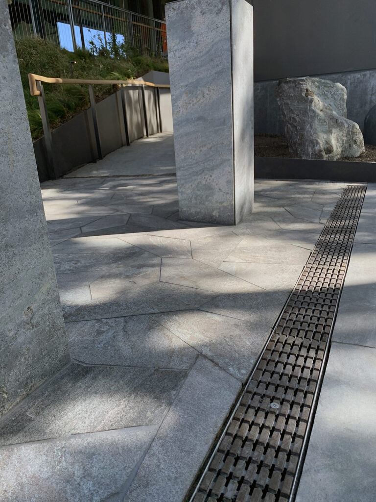 Plex 5″ x 20″ heavy-duty trench grate, cast ductile iron with baked-on-oil finish. DESIGN: Future Green Studio. INSTALLATION: Phase 1 Group. PROJECT: St. John’s Terminal, Manhattan offices for a global tech firm. LOCATION: New York, NY