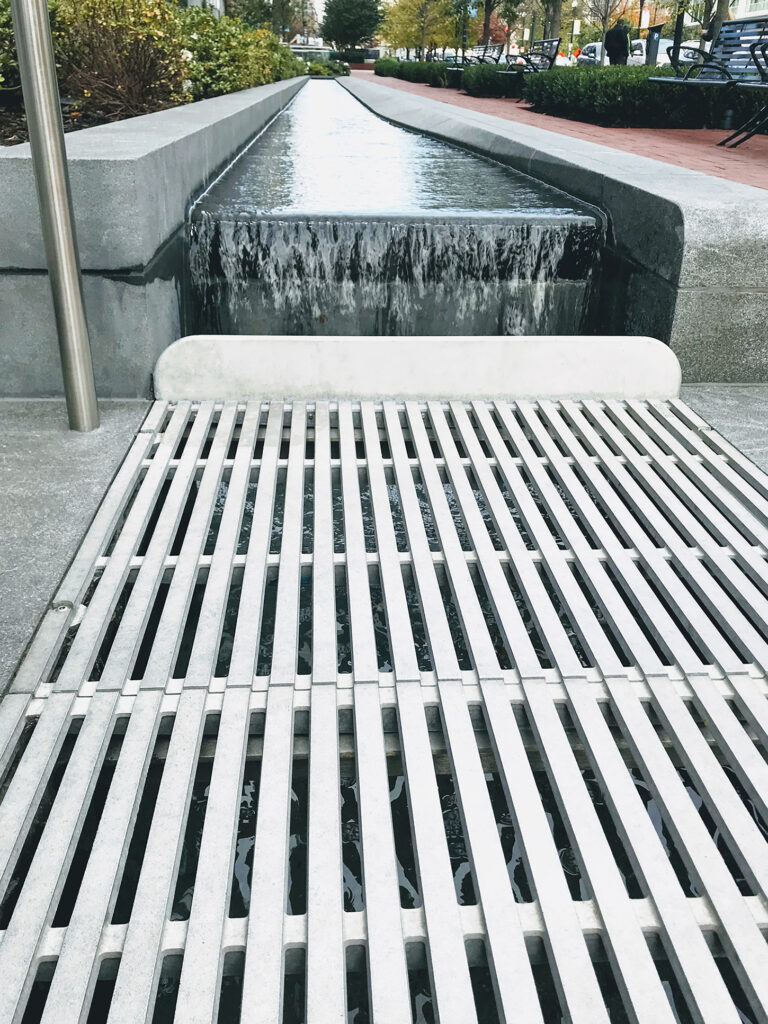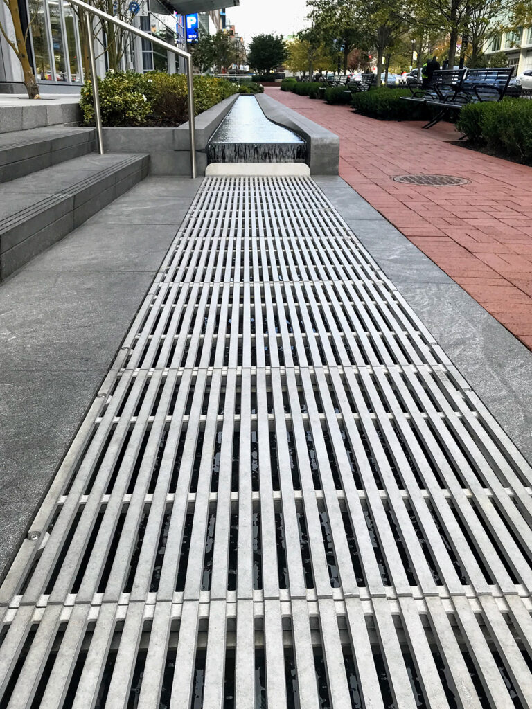 Que 30″ x 33″ trench grate, raw cast aluminum. DESIGN: GGN. PROJECT: 600 Massachusetts Avenue. LOCATION: Washington, DC.