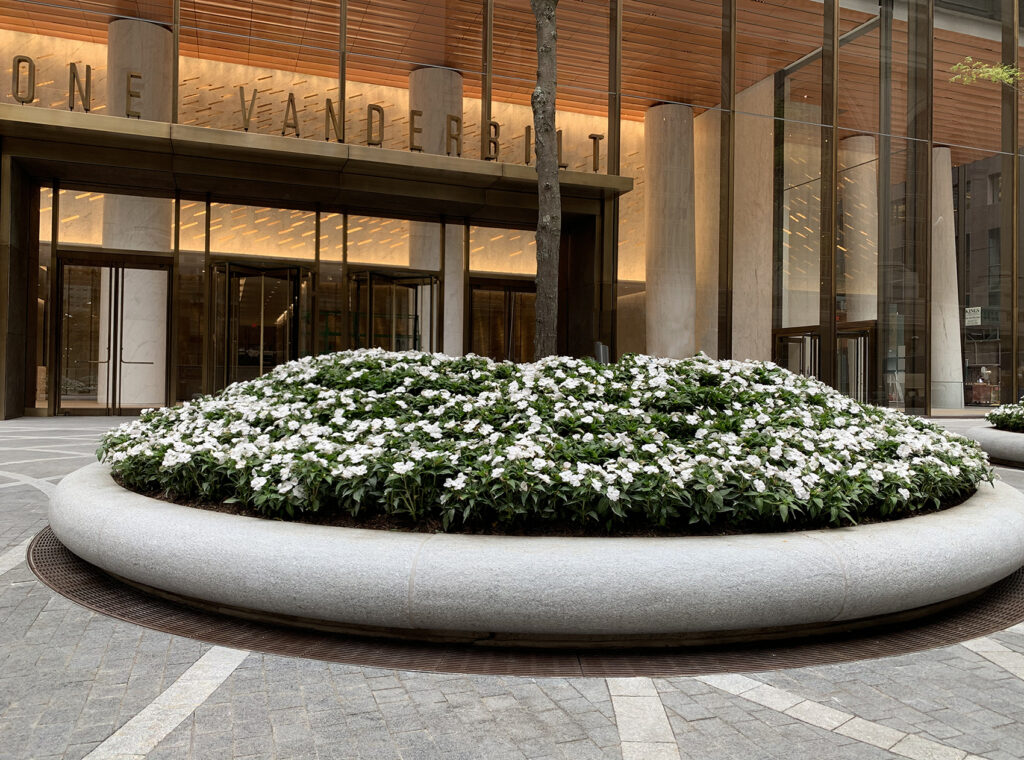 Que 10″ wide radius heel-proof trench grate, cast ductile iron with baked-on-oil finish. DESIGN: PWP Landscape Architecture. INSTALLER: Posillico. PROJECT: One Vanderbilt. LOCATION: New York, NY.