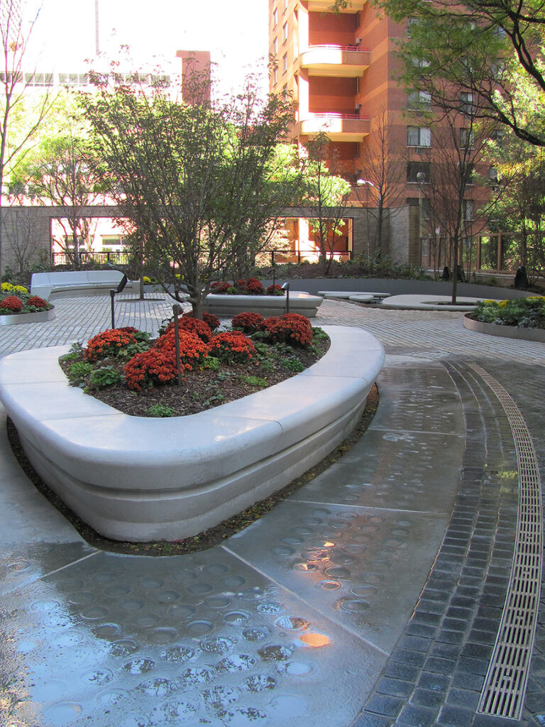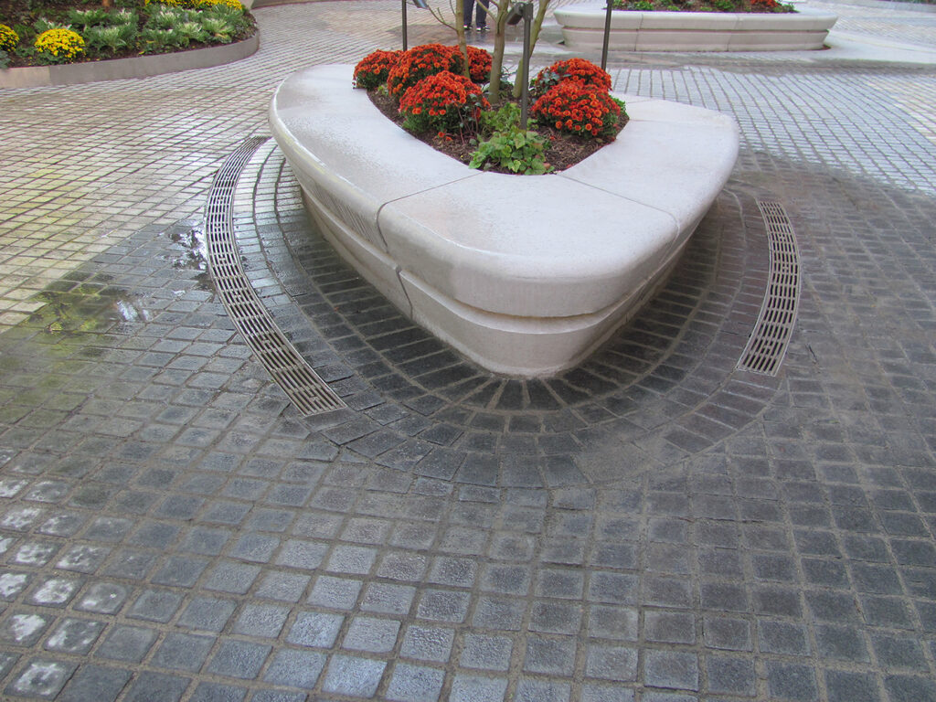 Que 10″ wide radius heel-proof trench grate, cast ductile iron with baked-on-oil finish. Shown three years after installation. DESIGN: PWP Landscape Architecture. INSTALLER: Posillico. PROJECT: One Vanderbilt. LOCATION: New York, NY.