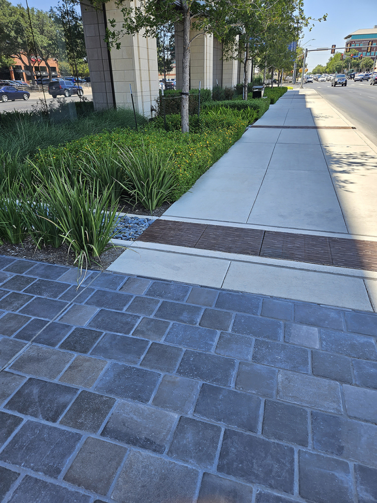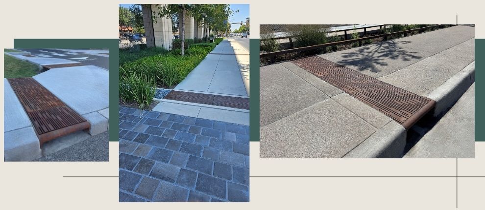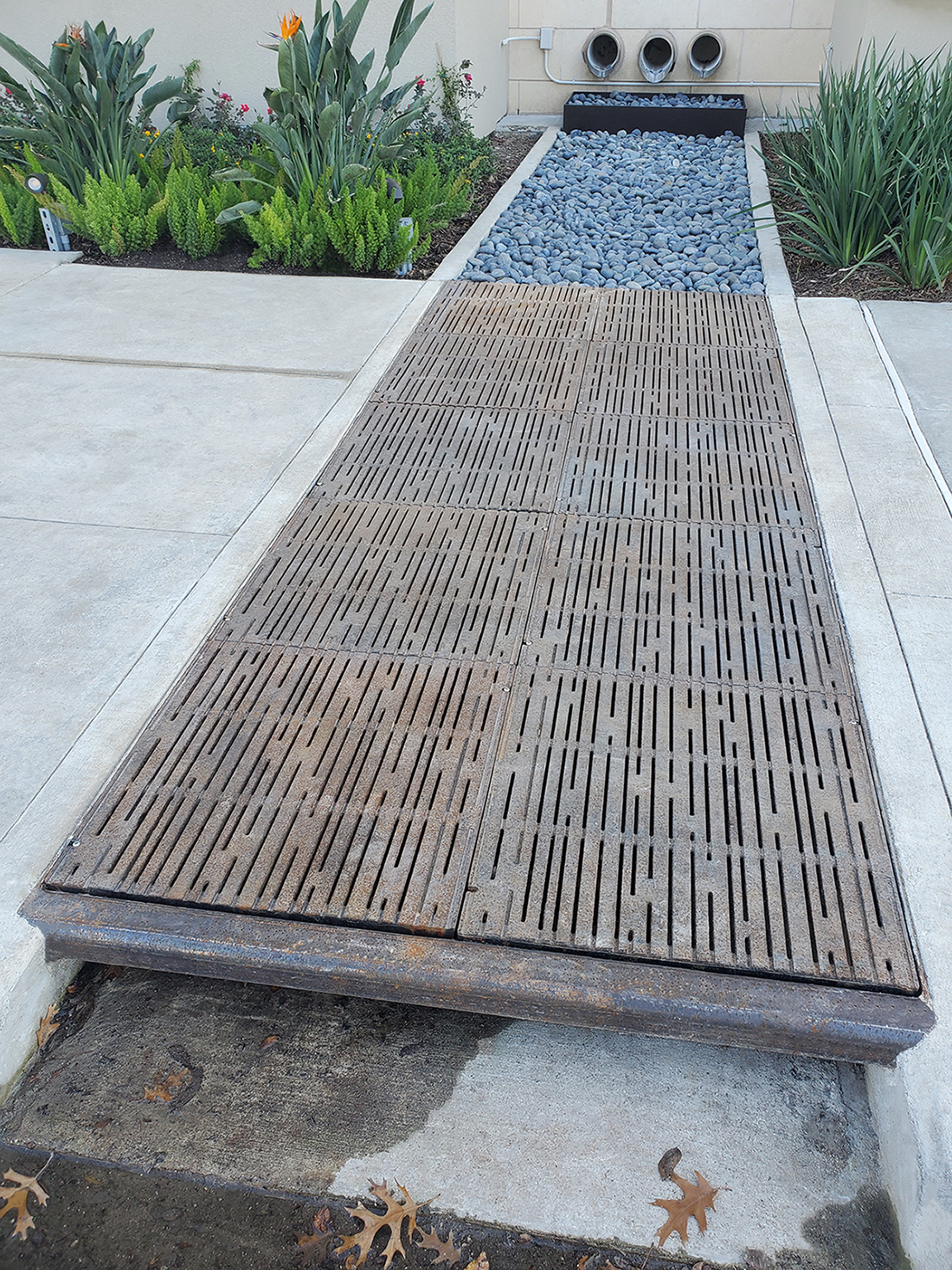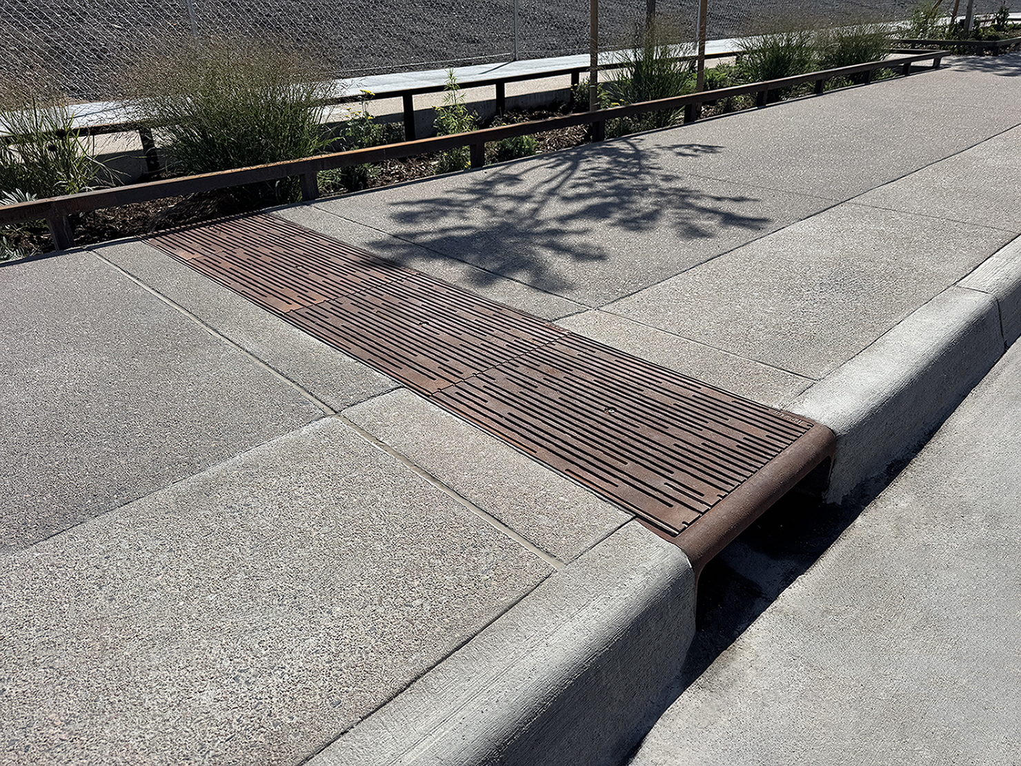 We designed a heavy-duty, cast iron curb inlet to interface with our standard steel trench frames. The frames cut across the sidewalk, with Rain grates covering the open runnel where water flows from the street into a bioswale on the other side. Click here for more information.