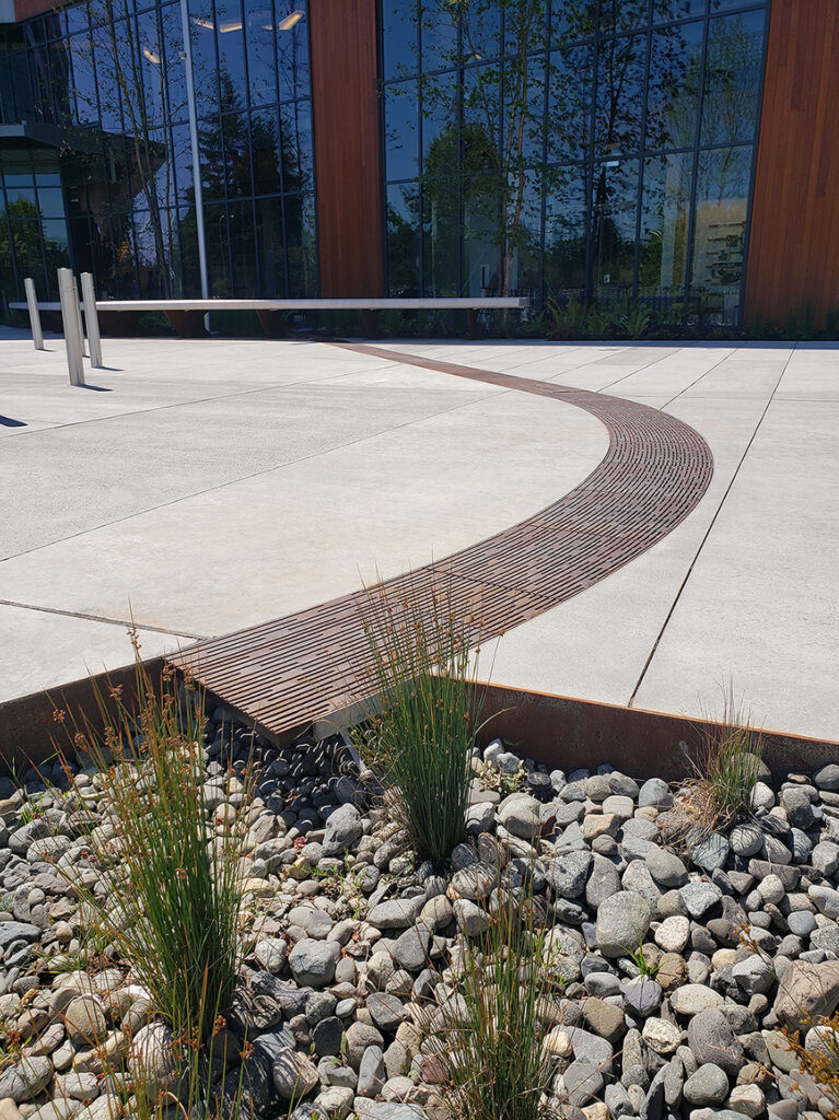 Rain 18″ heel-proof radius trench grate, cast iron with baked-on-oil finish. DESIGN: NBBJ. LANDSCAPE ARCHITECT: Berger Partnership. PROJECT: Alaska Airlines HQ Copper River Project. LOCATION: SeaTac, WA.