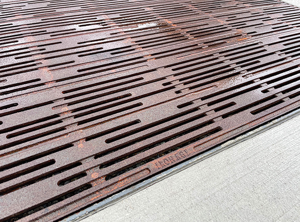 Rain 18″ heel-proof radius trench grate, cast iron with baked-on-oil finish. DESIGN: NBBJ. LANDSCAPE ARCHITECT: Berger Partnership. PROJECT: Alaska Airlines HQ Copper River Project. LOCATION: SeaTac, WA.
