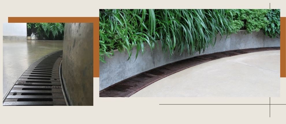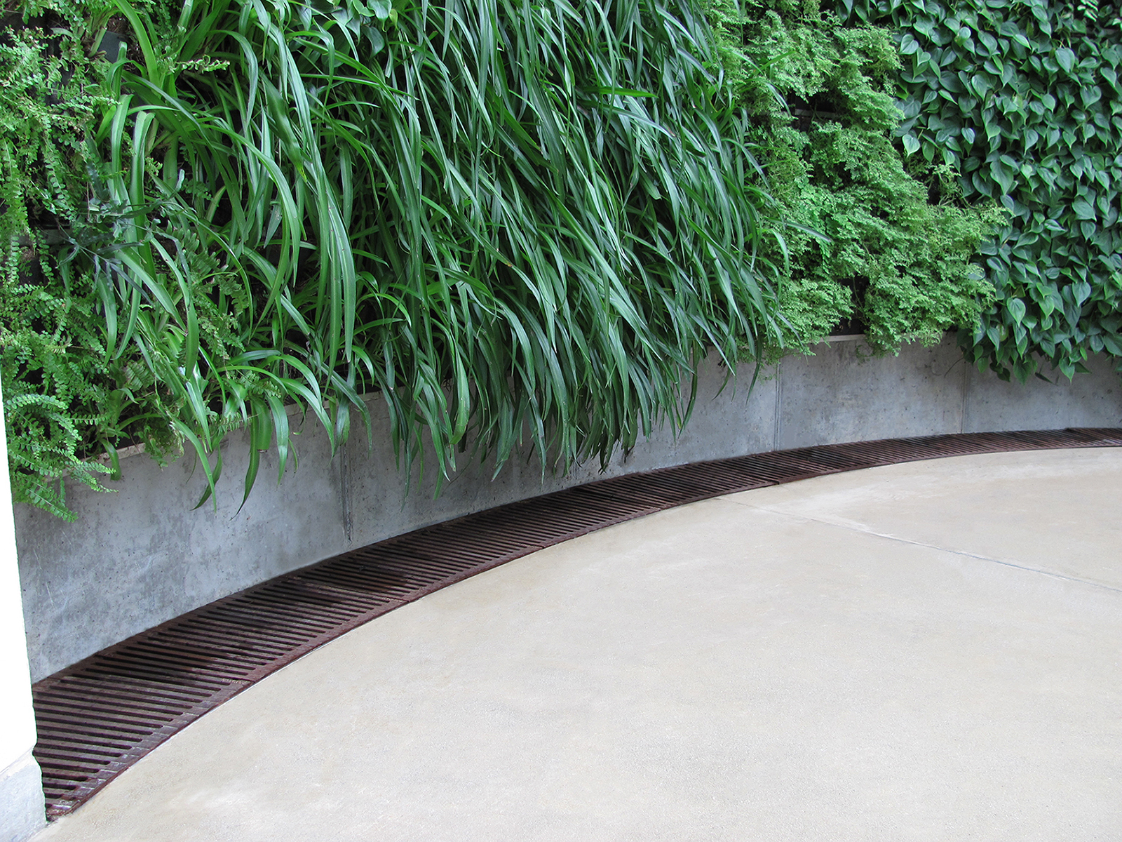Regular Joe 5″ wide radius trench grate, cast iron with baked-on-oil finish. DESIGN: Sikora Wells Appel. PROJECT: Green Wall at Longwood Gardens. LOCATION: Kennett Square, PA.