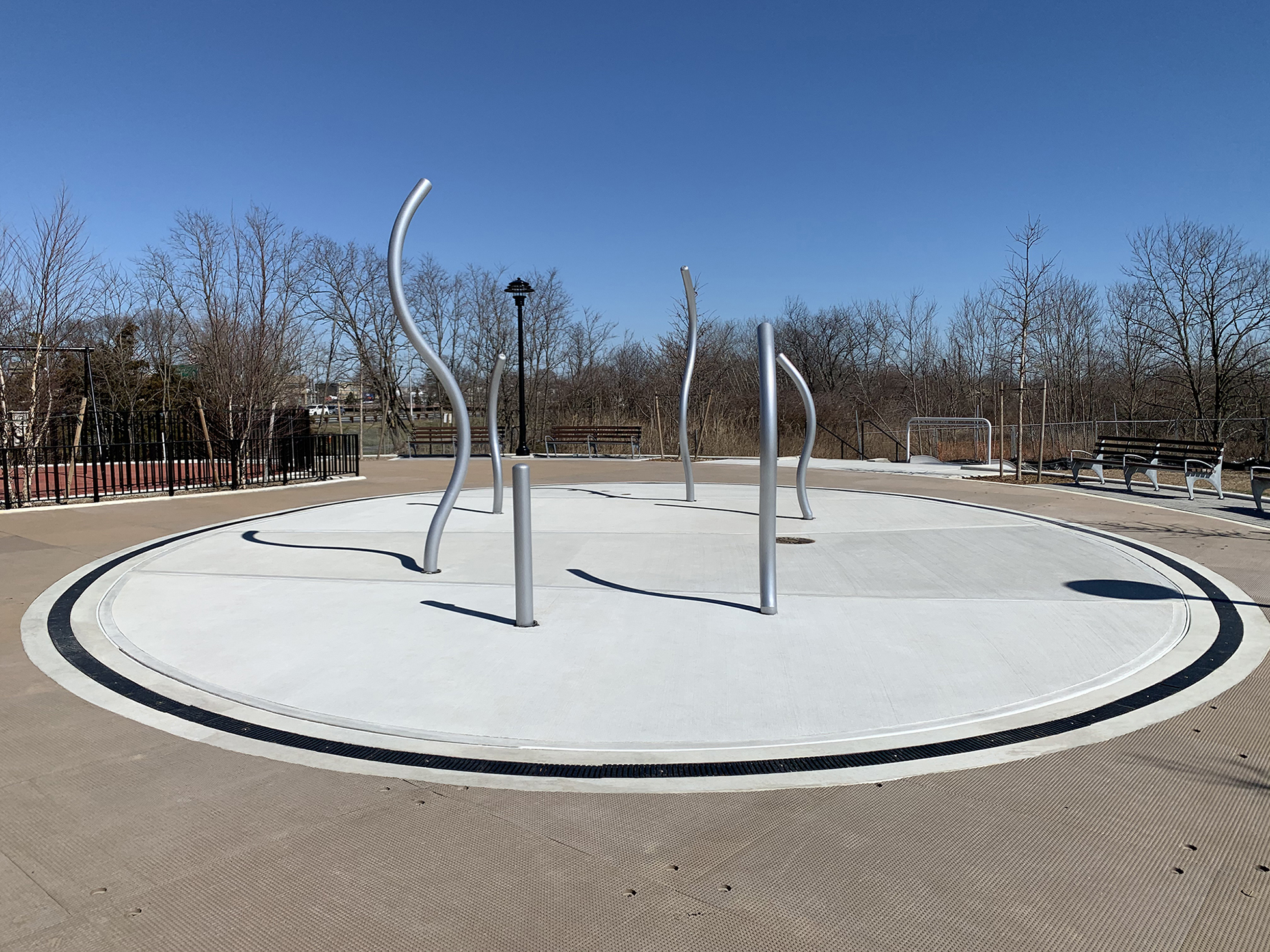 Regular Joe 5″ wide radius trench grate, cast iron with black powder coat finish, newly installed. DESIGN: Hargreaves Jones. INSTALLER: Coastal Contracting Corp. PROJECT: Brigham Park, NYC Parks. LOCATION: Brooklyn, NY.