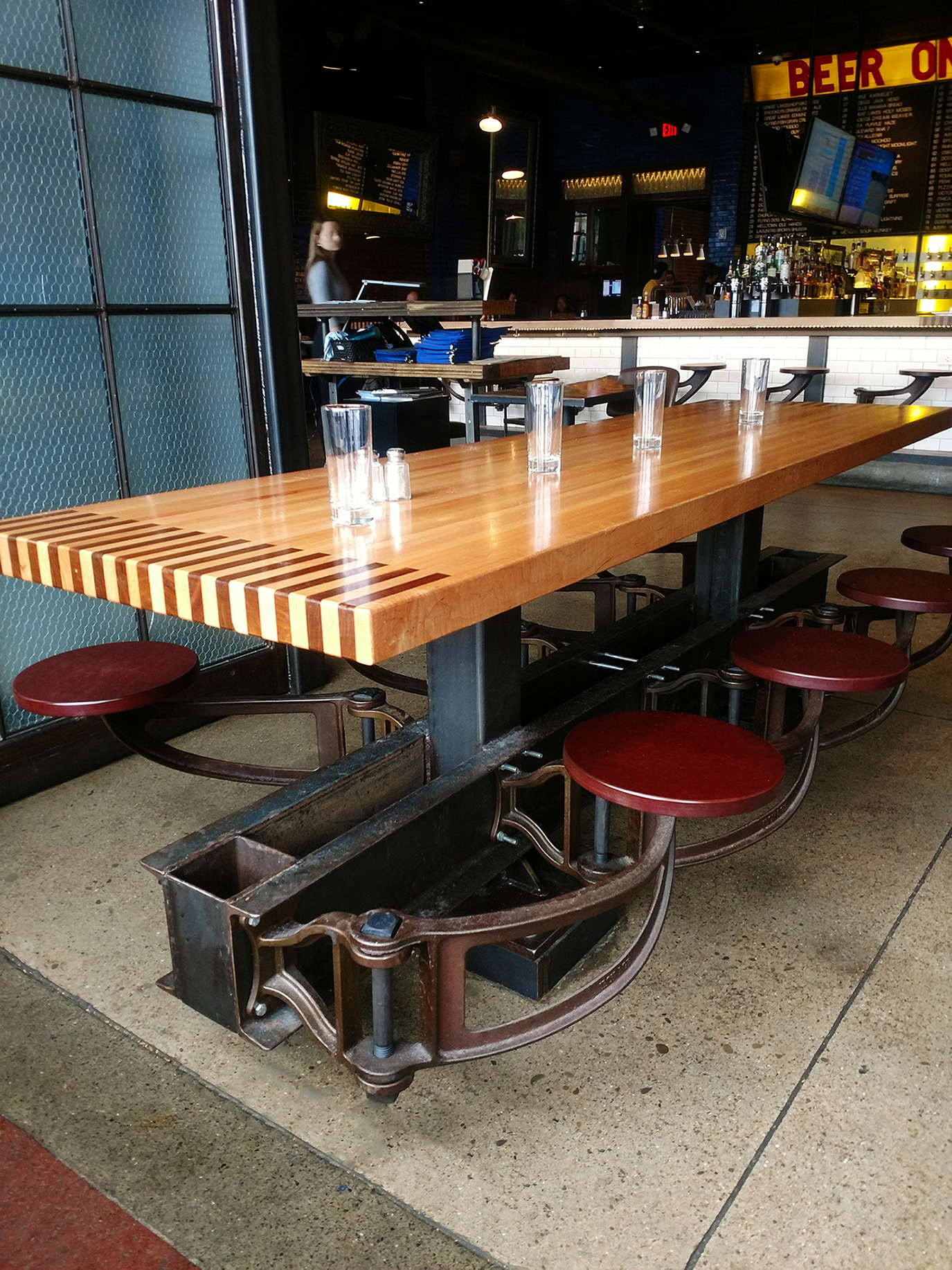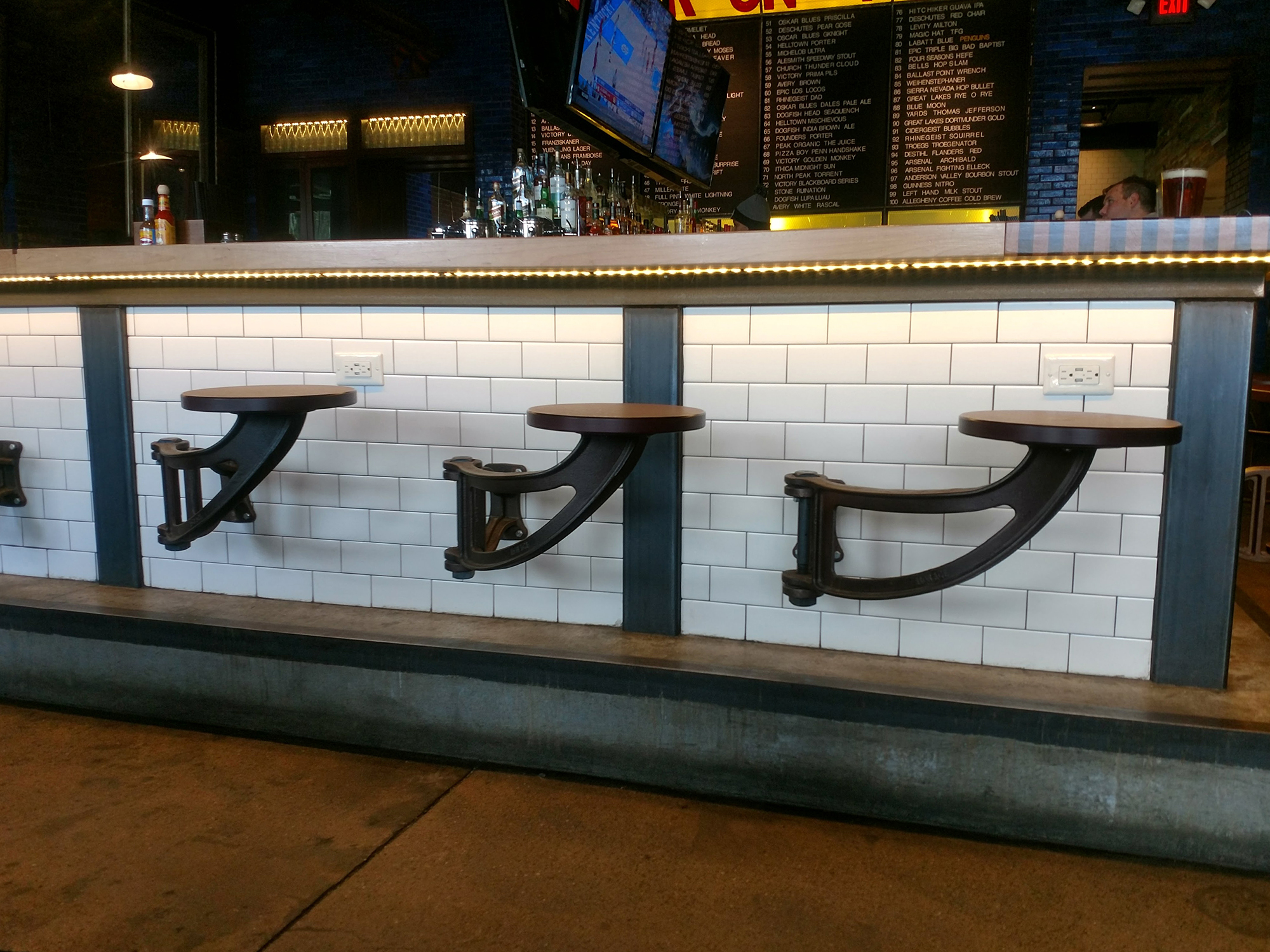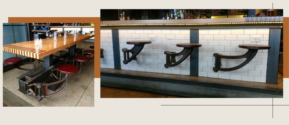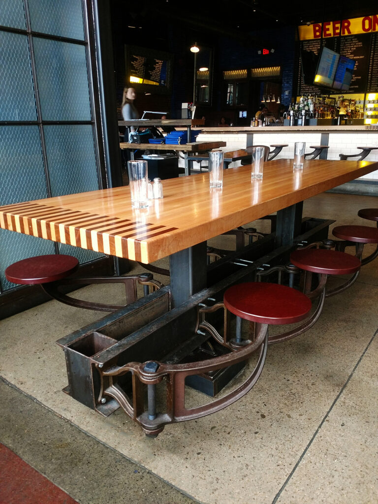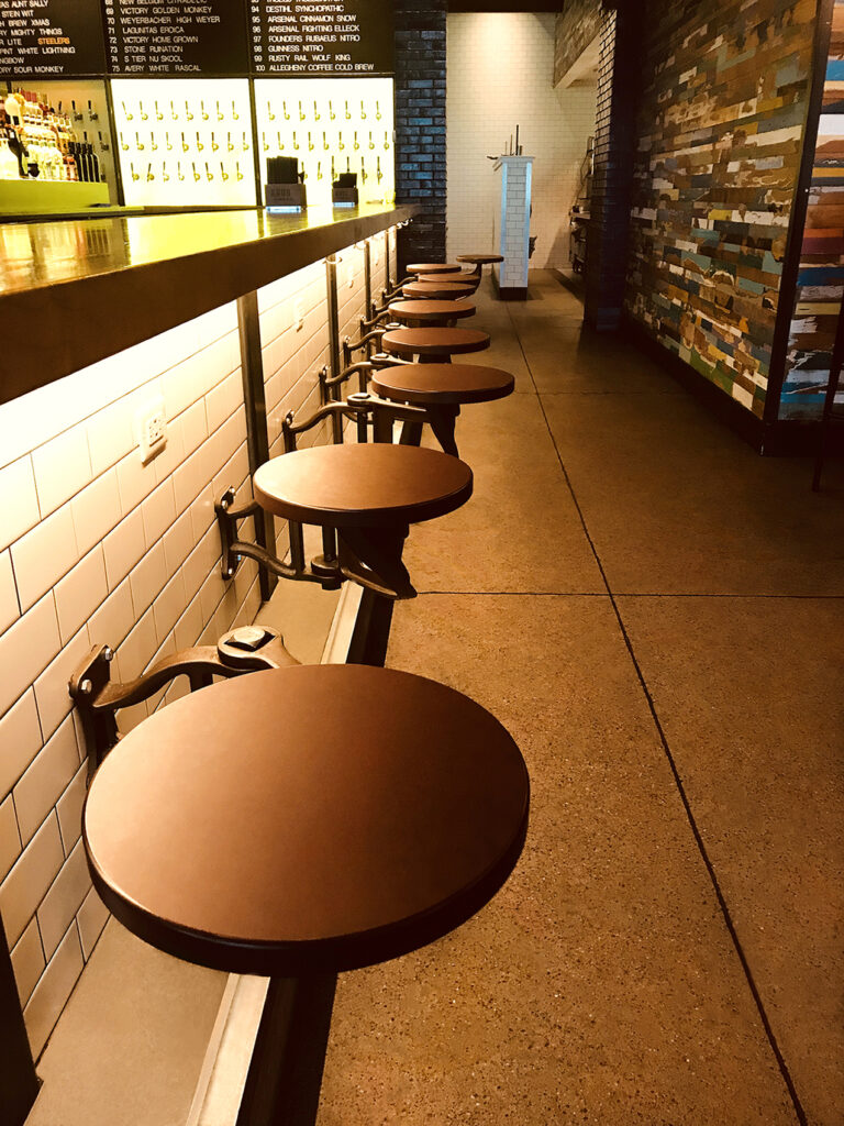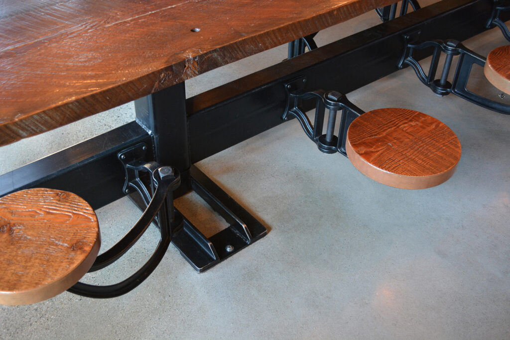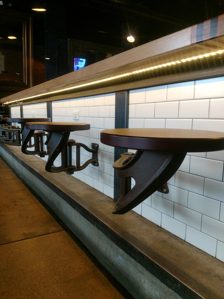 Swing Arm seat, cast ductile iron with powder coat finish, and Richlite seat. Available with left and right hand swing. Project: Urban Tap, Pittsburgh, PA.