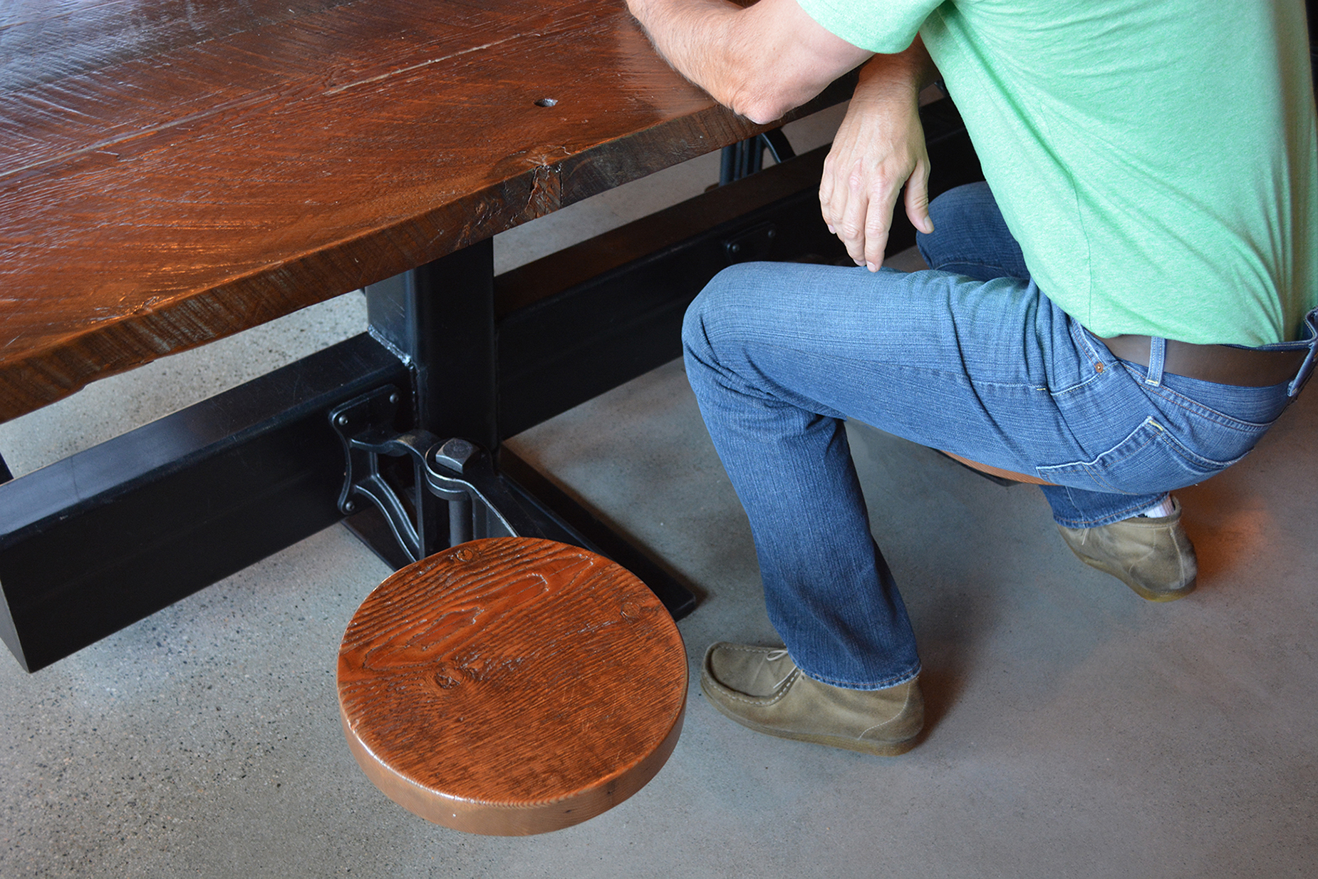 Iron Age’s Swing Arm chairs can be used individually or in sets, such as the table shown here. Customization is easy with a wide variety of seat and table top materials & configurations available.