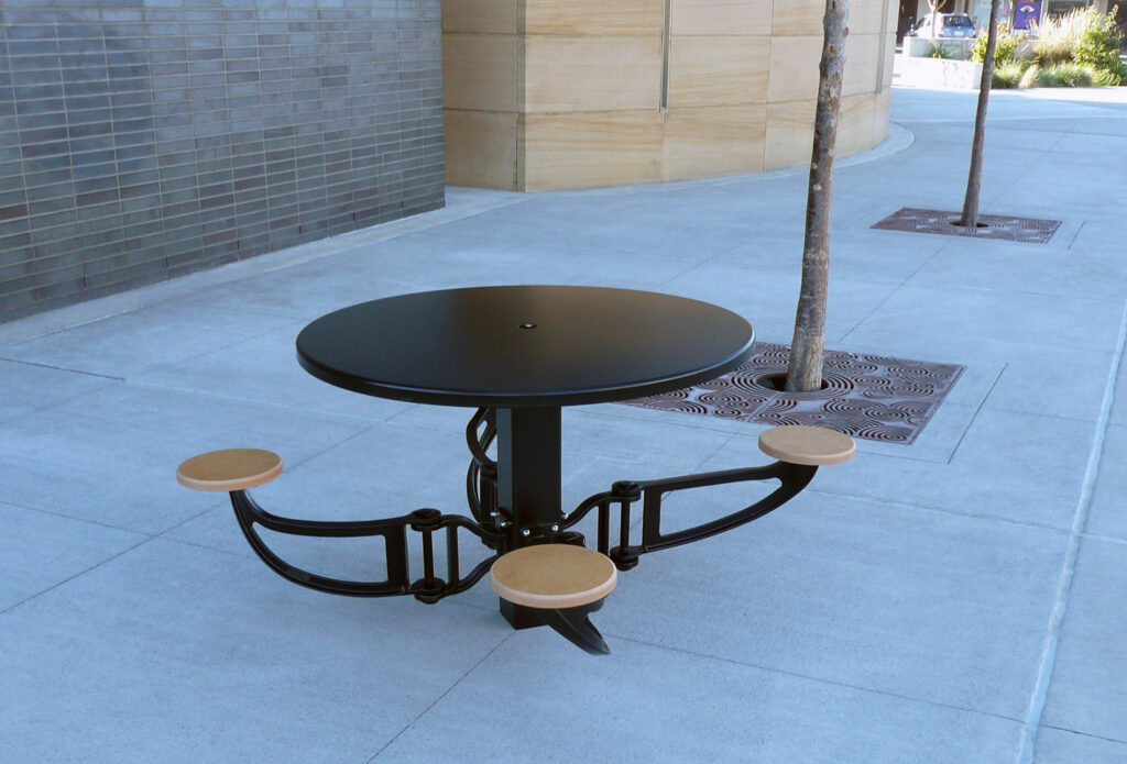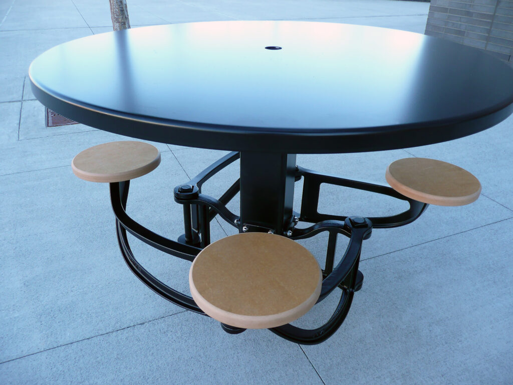 Swing Arm seat, cast ductile iron with powder coat finish, and Richlite seat. Available with left and right hand swing. Pictured here with 48″ Dia. steel table.