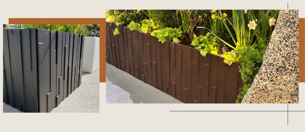Modular Planter Box system shown in three different patterns (from left to right): Divisadero cast iron panels with baked-on-oil finish; Tempe cast iron panels with black powder coat finish; Peak cast iron panels with white powder coat finish.