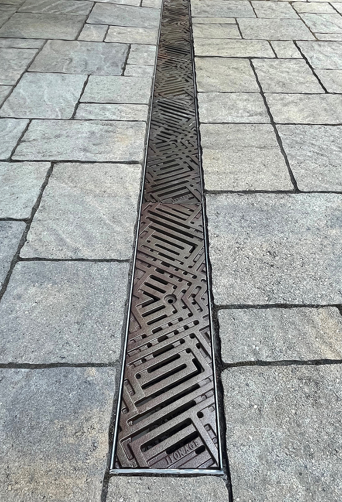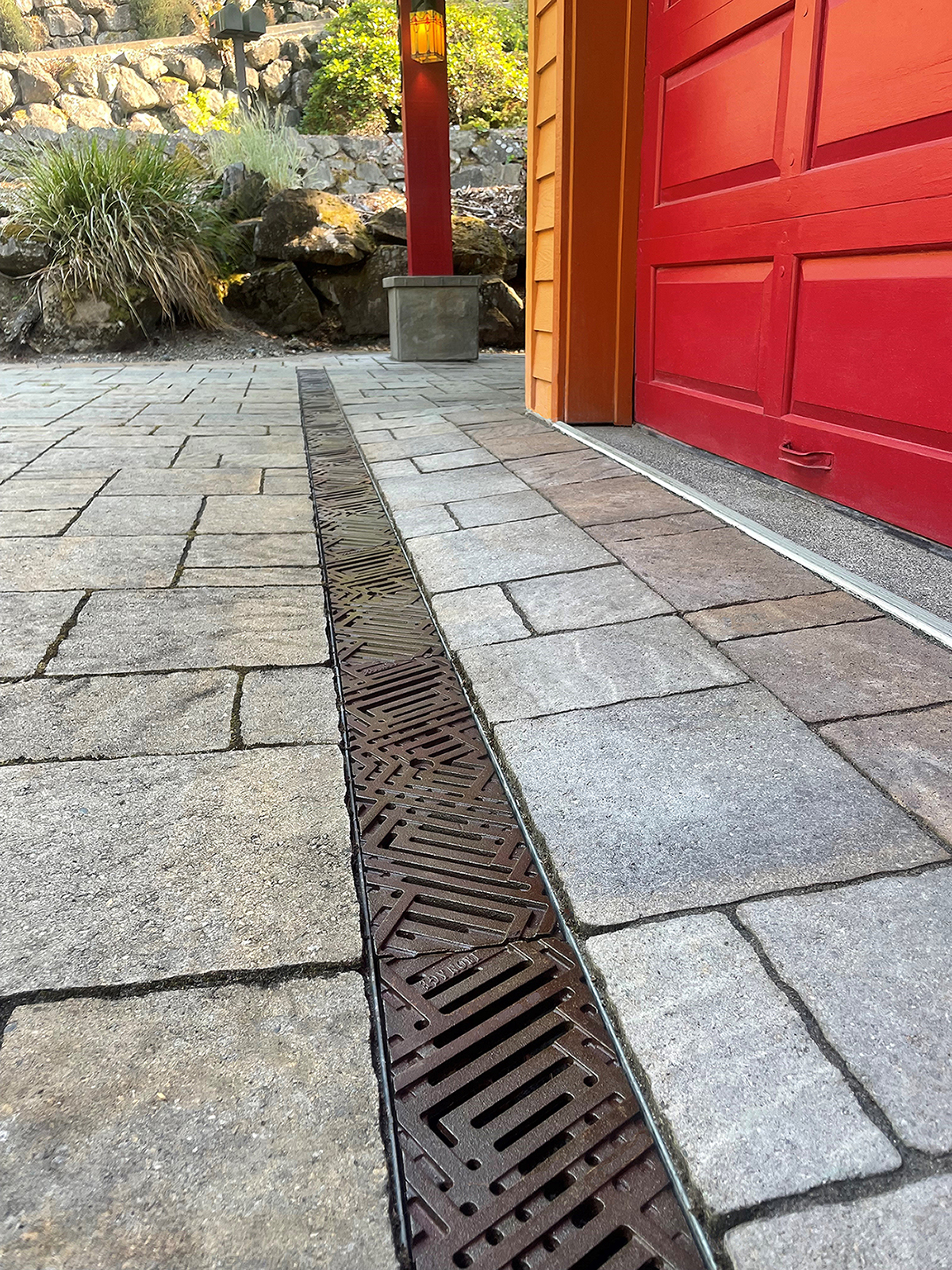 Thunderbird 5″ x 20″ heel-proof trench grate, cast ductile iron with baked-on-oil finish. PROJECT: Residential driveway. LOCATION: Burien, WA.