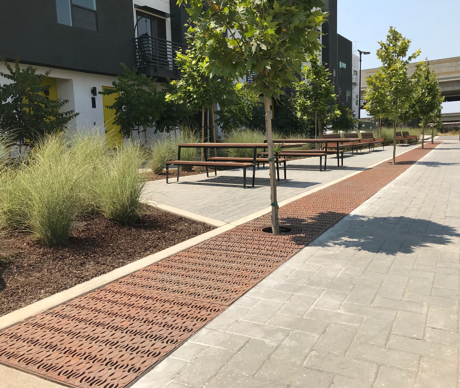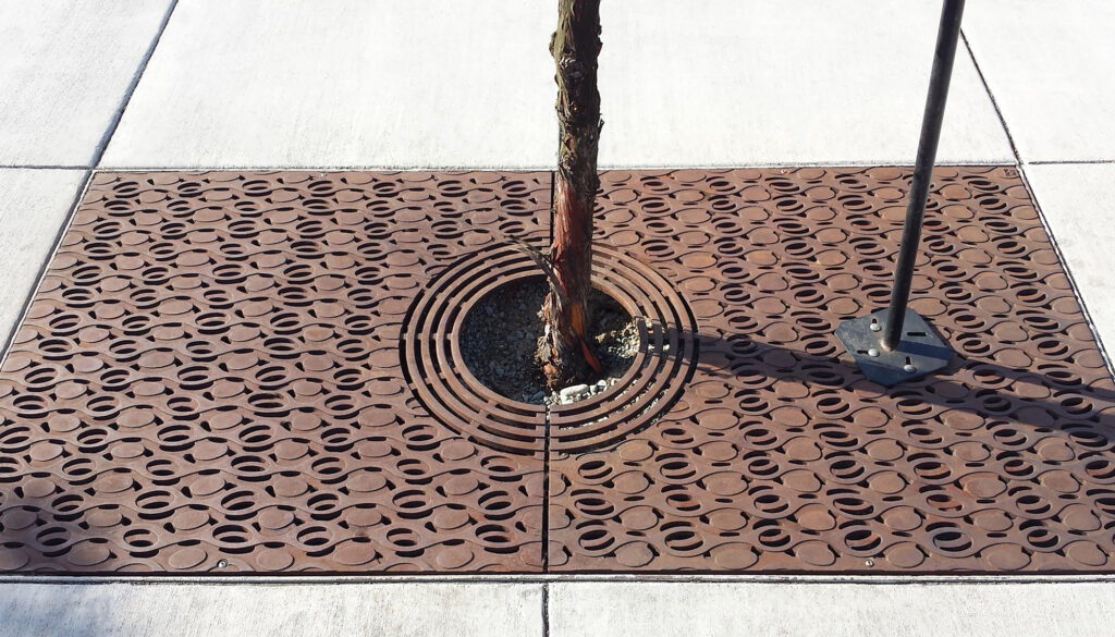 Janis 3′ x 6′ tree grate, arrayed with 3′ x 3′ Janis tree grate extension panels; cast iron with baked-on-oil finish. Project: 1401 Wood Street, Oakland, CA.