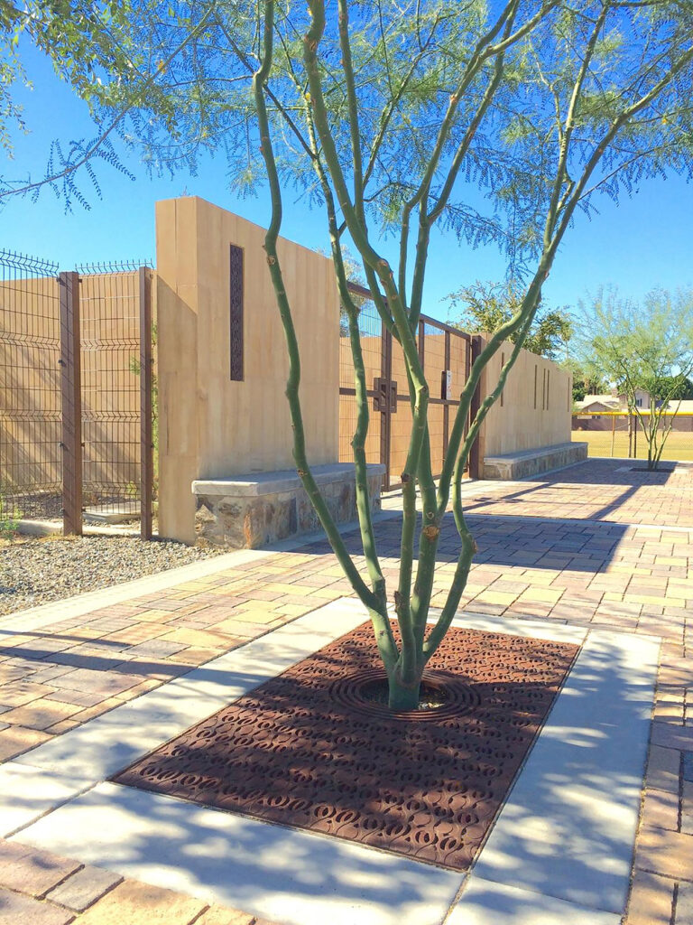 Janis 3′ x 6′ tree grate, cast iron with our baked oi oil finish. Also pictured is our 5″ Janis trench grate, used as a sconce. Project: All Saints Church, Phoenix, AZ.