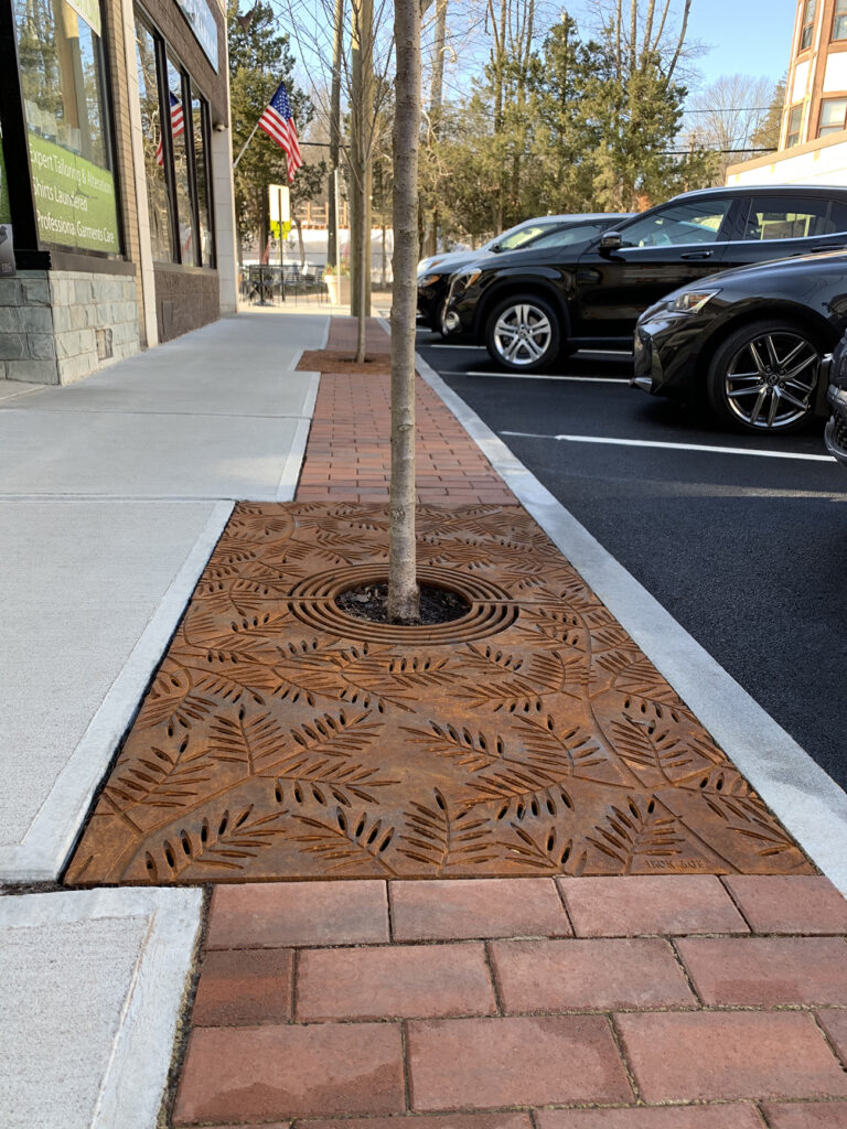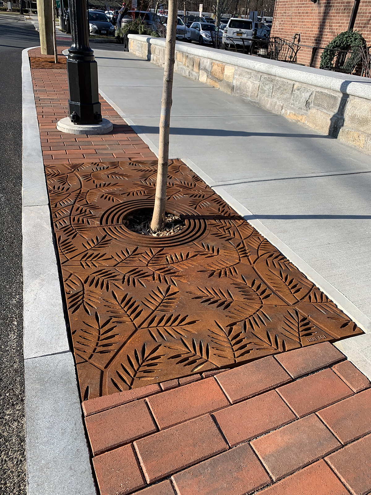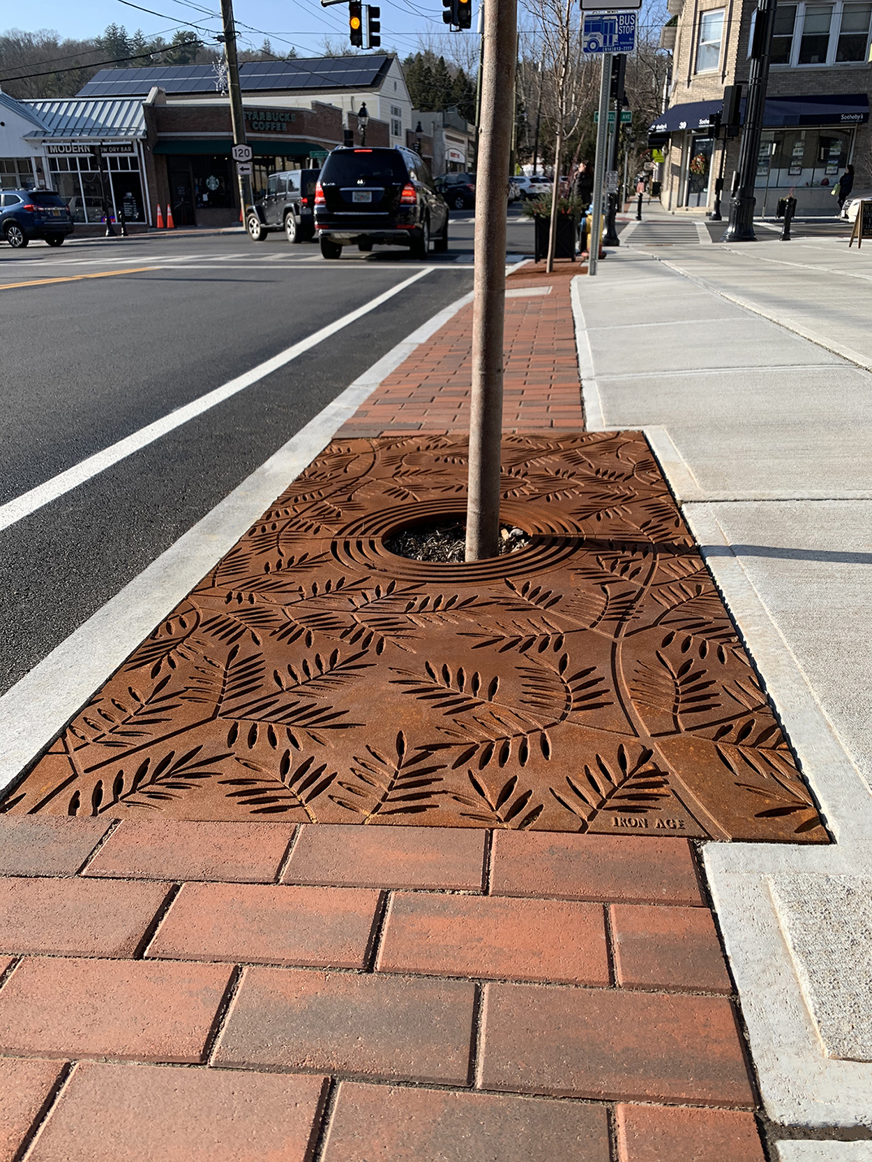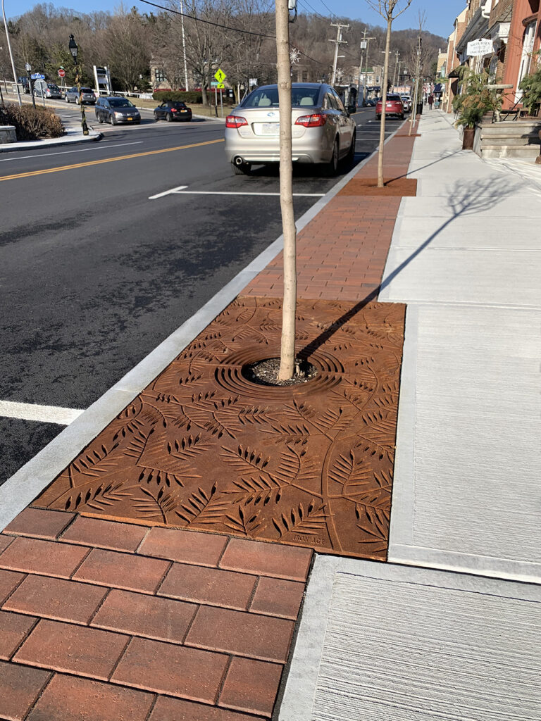 Locust 3′ x 6′ tree grate, cast iron with baked-on-oil finish. DESIGN: WSP USA. INSTALL: ELQ Industries. PROJECT: Chappaqua Streetscape. LOCATION: Chappaqua, NY.