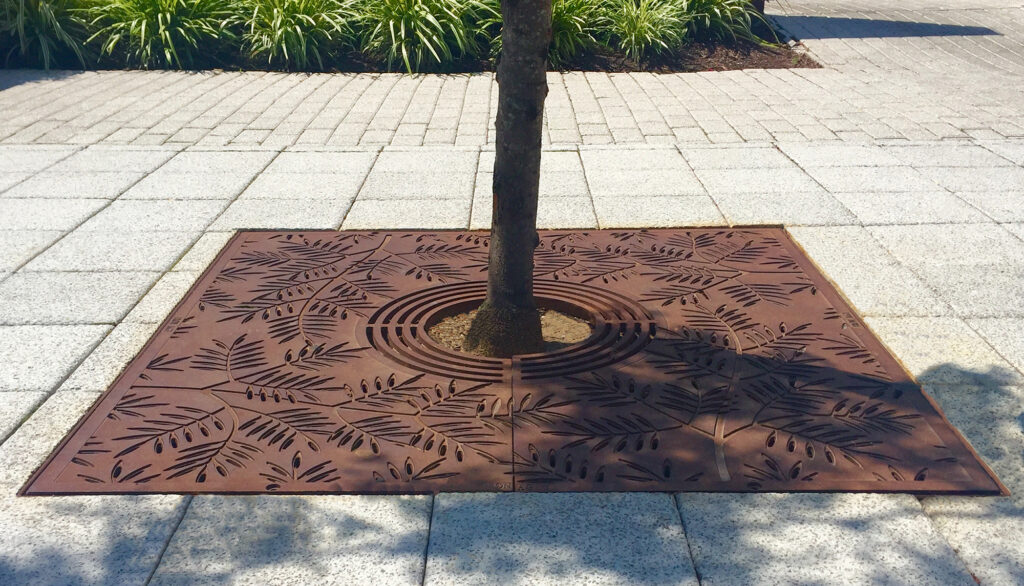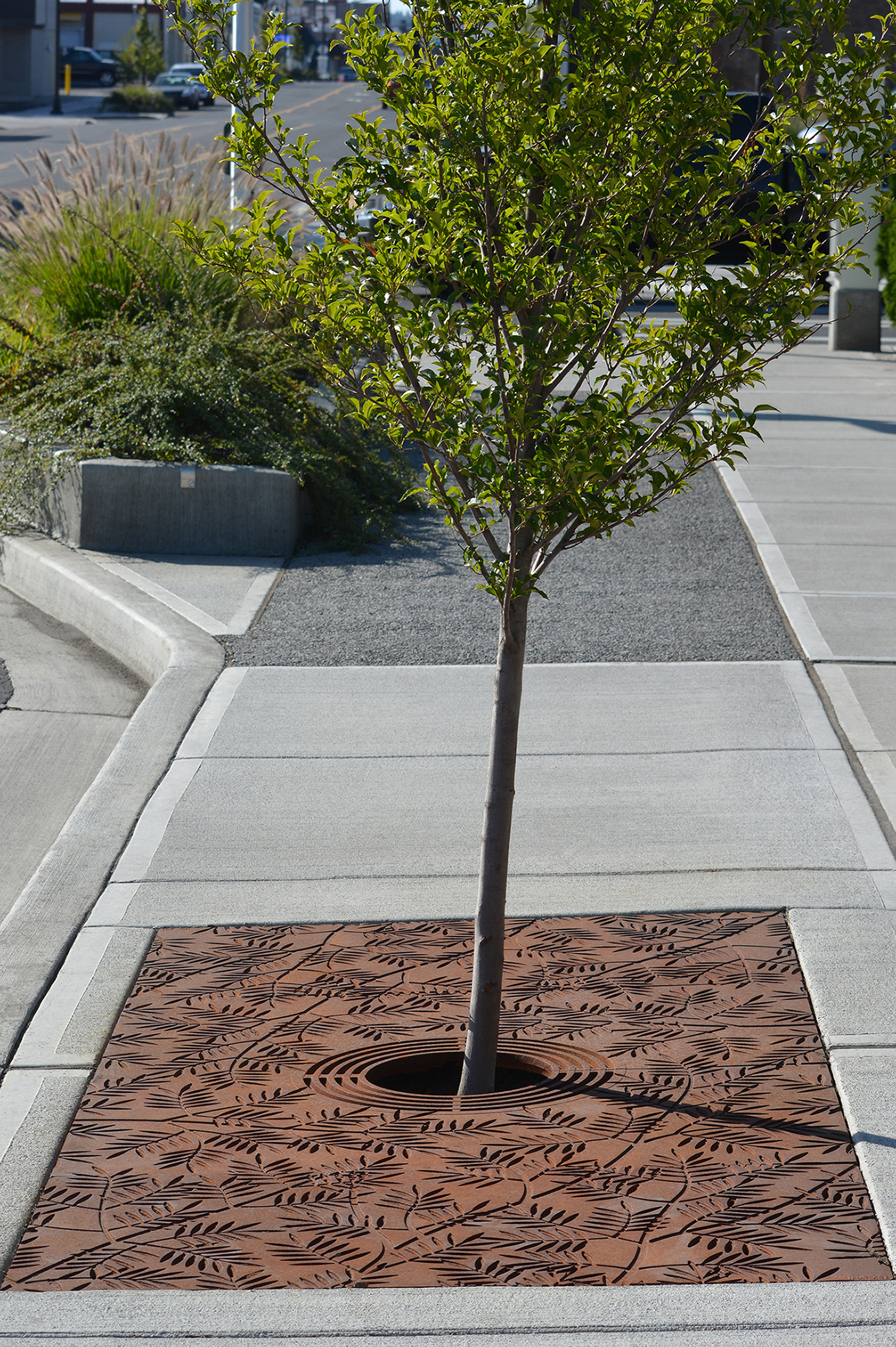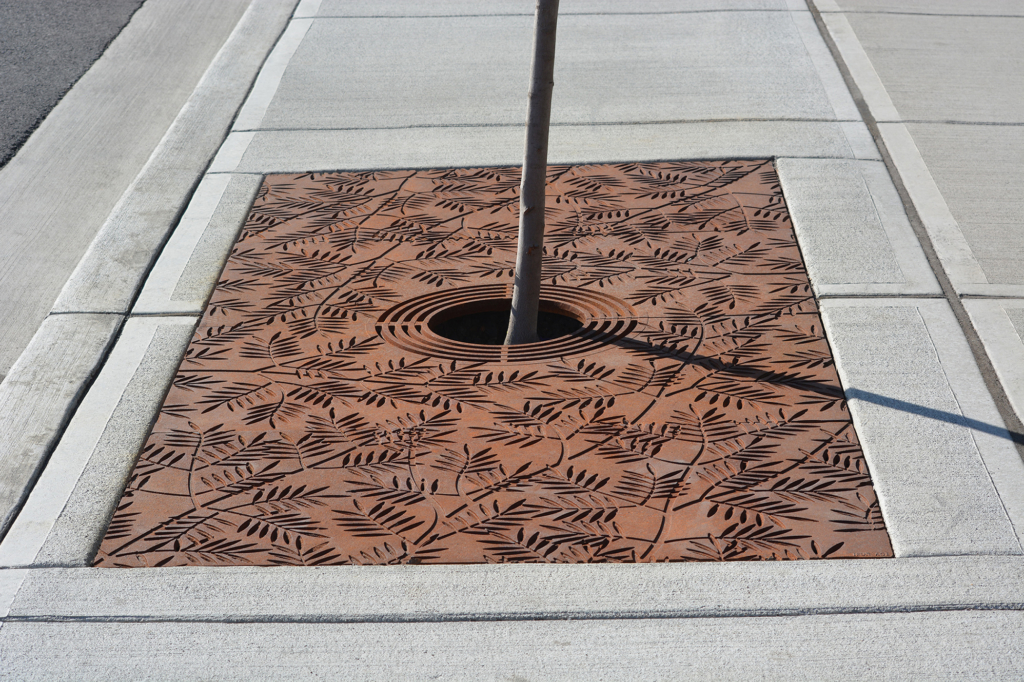 Locust 4′ x 8′ heel-proof tree grate, raw cast iron. PROJECT: Monroe Street. LOCATION: Spokane, WA.