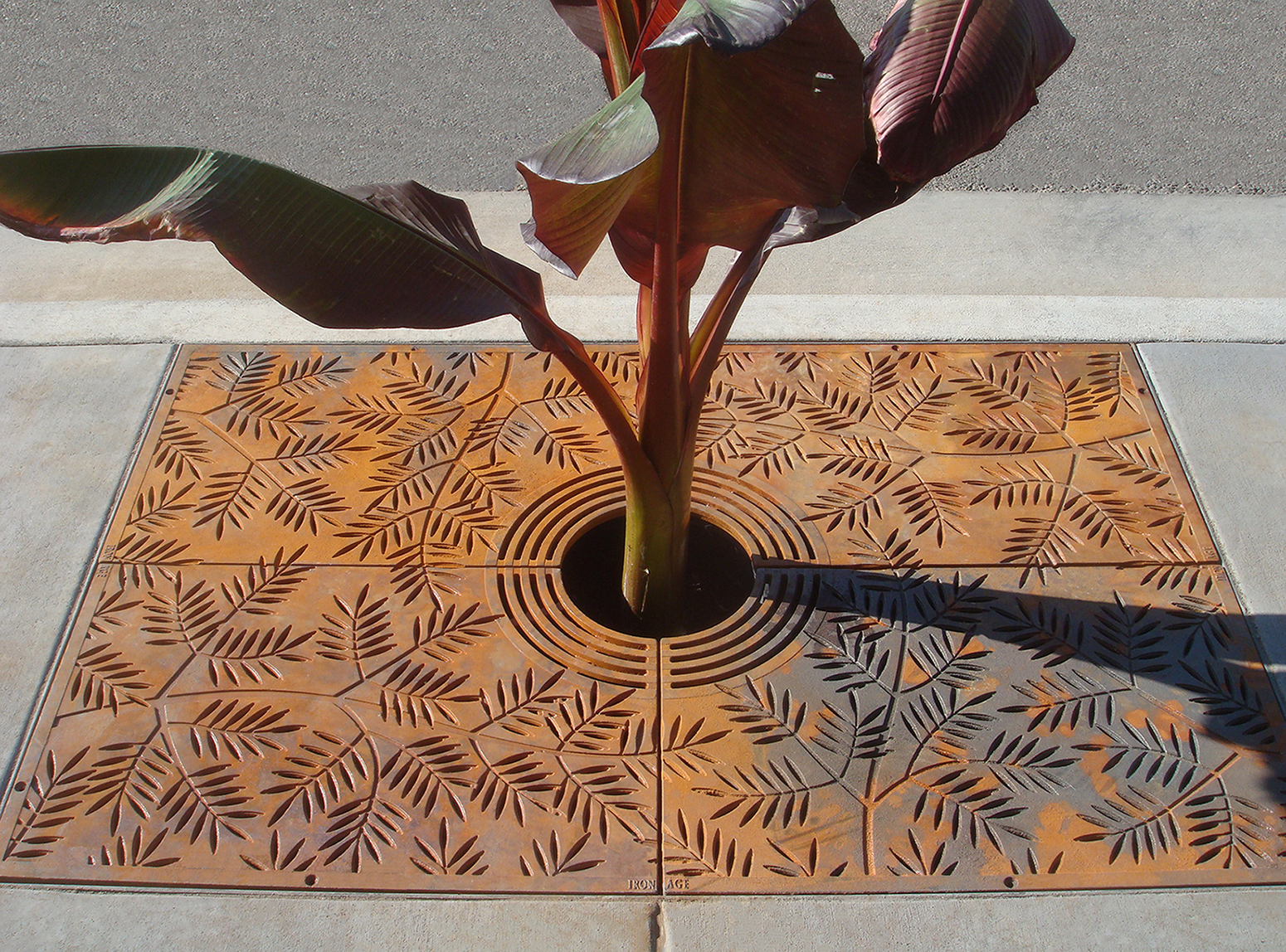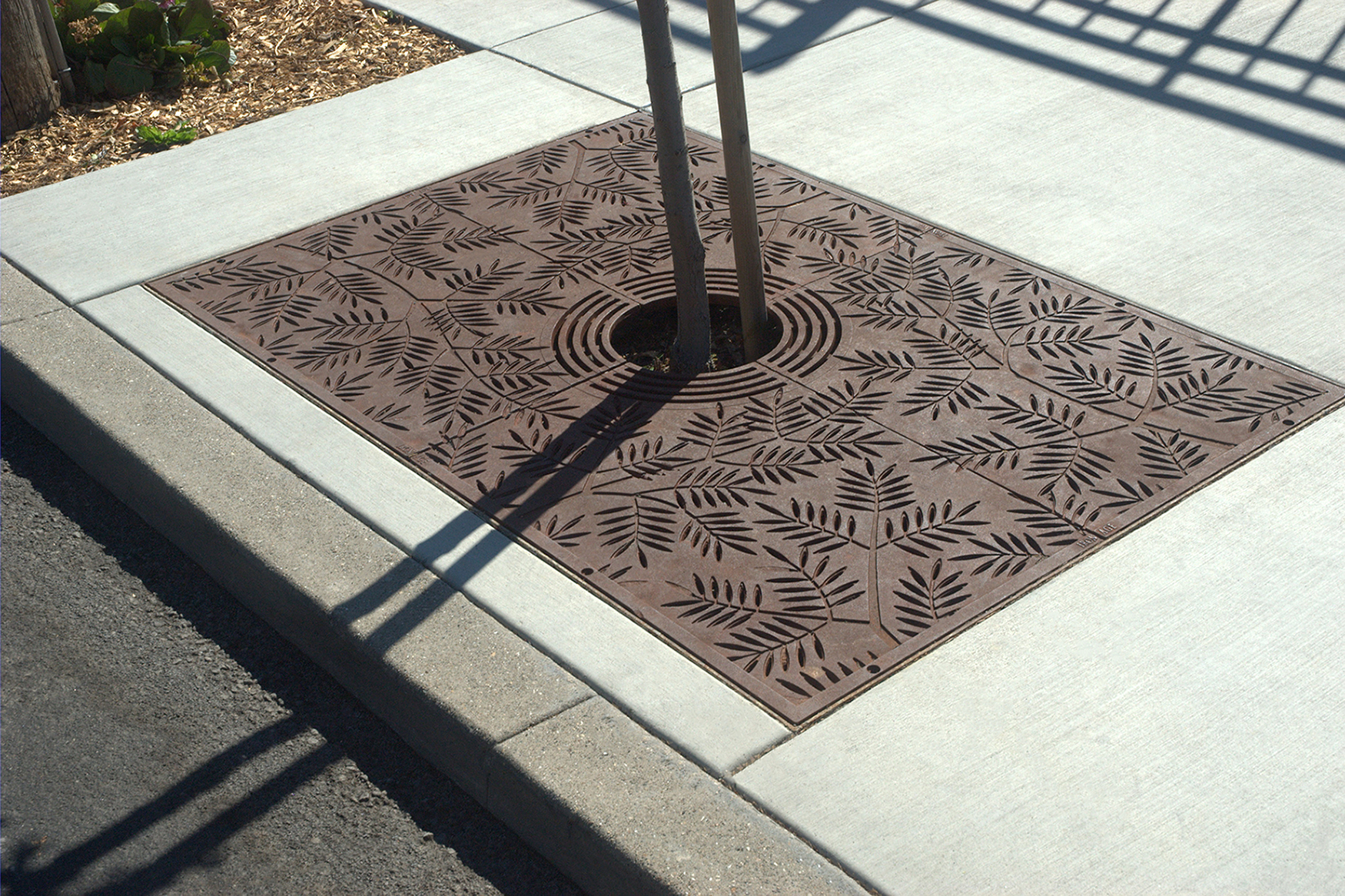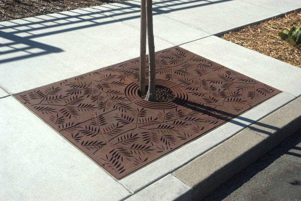 Locust 4′ x 6′ tree grate, cast iron with baked-on-oil finish. LOCATION: Berkeley, CA.