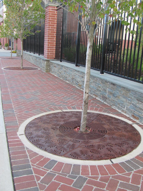 Locust 4′ x 4′ tree grate, raw cast iron. PROJECT: Maryland Live Casino. LOCATION: Hanover, MD.