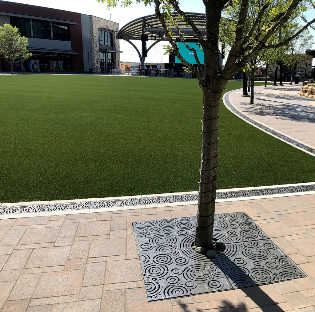 Oblio 4′ x 4′ heel-proof tree grate, cast iron with “antique bronze pearlescent” powder coat finish. DESIGN: The Olsson Studio. INSTALL: Superscapes. PROJECT: Grandscape. LOCATION: The Colony, TX.