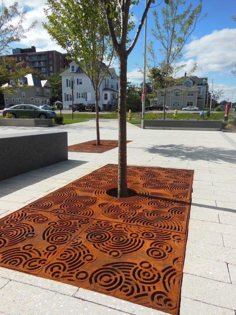 Oblio 4′ x 6′ heel-proof tree grate, cast iron with baked-on-oil finish. LOCATION: Mount Vernon, WA *Please note: this tree grate now comes in four pieces vs. two as shown here.