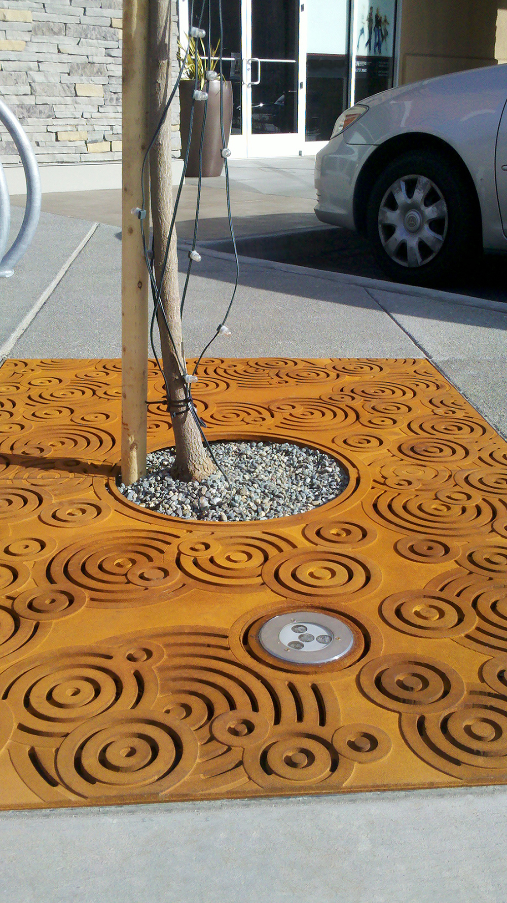 Oblio 4′ x 6′ heel-proof tree grate*, raw cast iron. LOCATION: Pleasanton, CA *Please note: this tree grate now comes in four pieces vs. two as shown here.