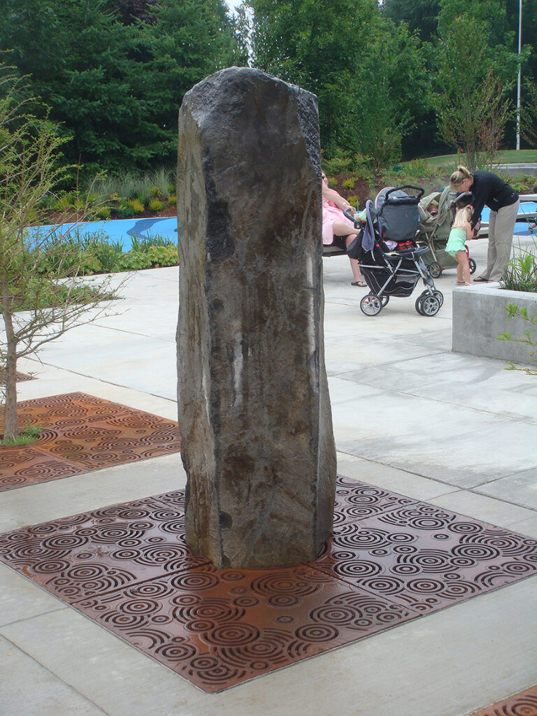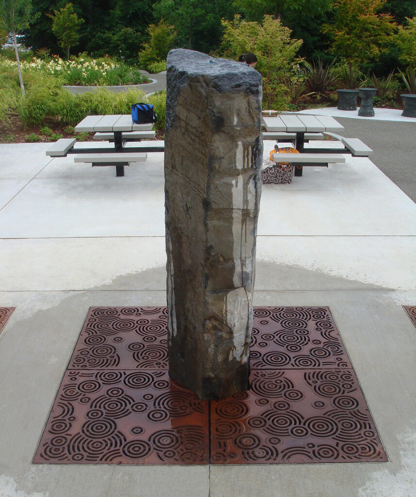 Oblio 6′ x 6′ heel proof tree grate. DESIGN: Richard Vandemark, Landscape Architect, Inc. PROJECT: Crossroads Community Park. LOCATION: Bellevue, WA.