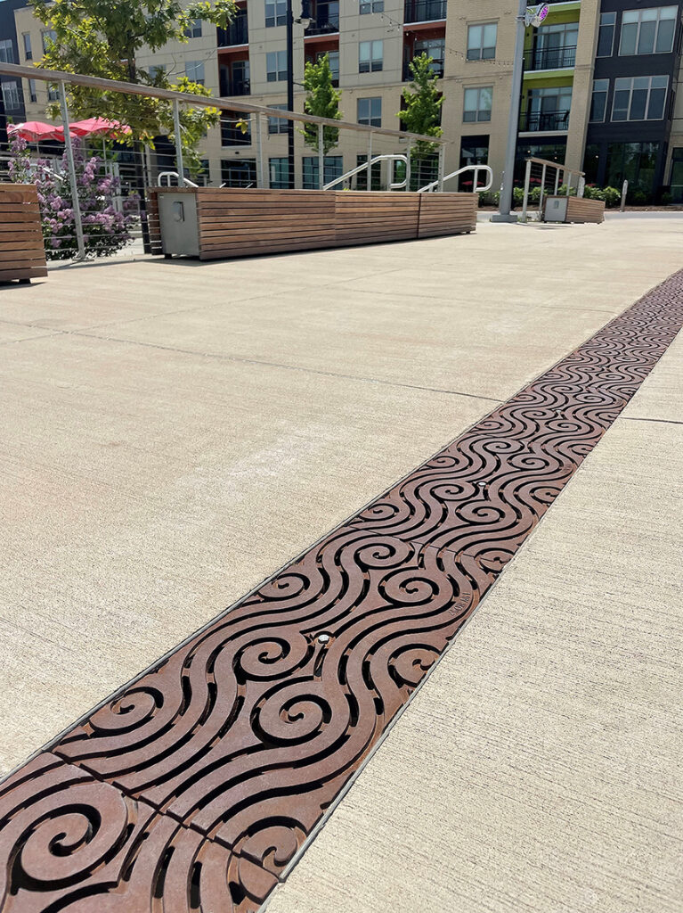 Argo 10″ x 20″ trench grate, cast ductile iron with our baked-on-oil finish. DESIGN: Context Design. PROJECT: Ironworks Plaza & Rink. LOCATION: Mishawaka, IN.