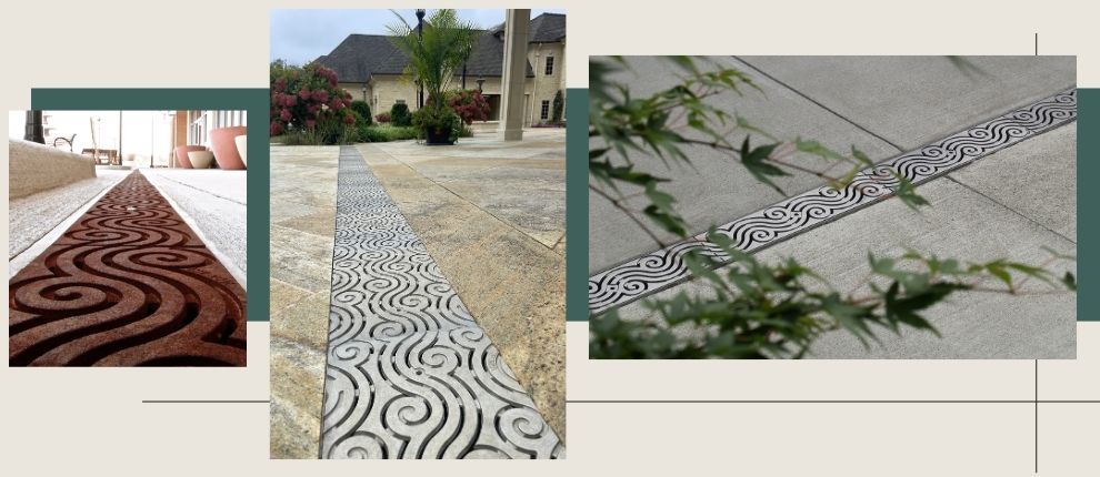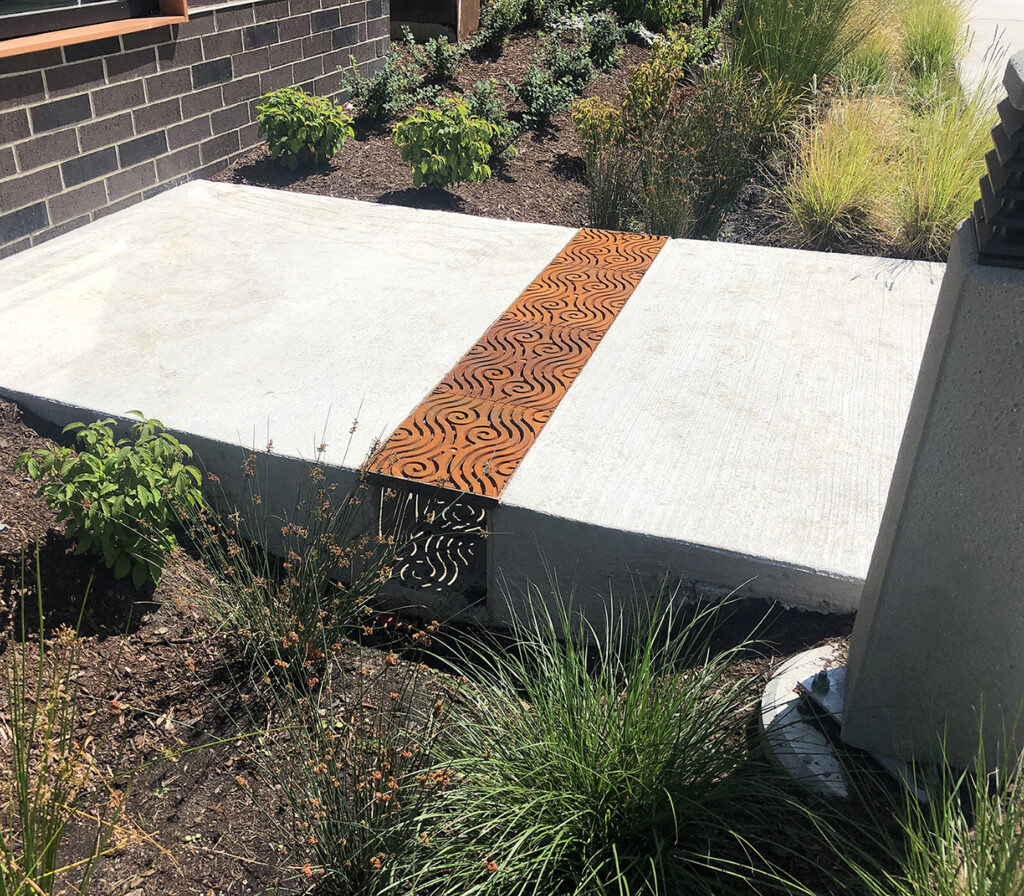 Argo 5″ x 20″ heel proof trench grates, raw cast iron shown newly installed (gunmetal grey) and 3 days later (oxidization started) after a hard rain. PROJECT: Residential patio. LOCATION: Bellingham, WA
