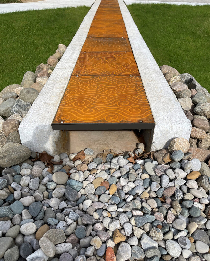 Street curb inlets drain into a large rain garden/bioswale. Each inlet is covered with our Argo 24″ x 18″ solid castings in raw cast ductile iron. The bioswale ends are surrounded by rocks and gravel to slow erosion of the sloped, grass-covered surface. Project Location: Detroit, MI.
