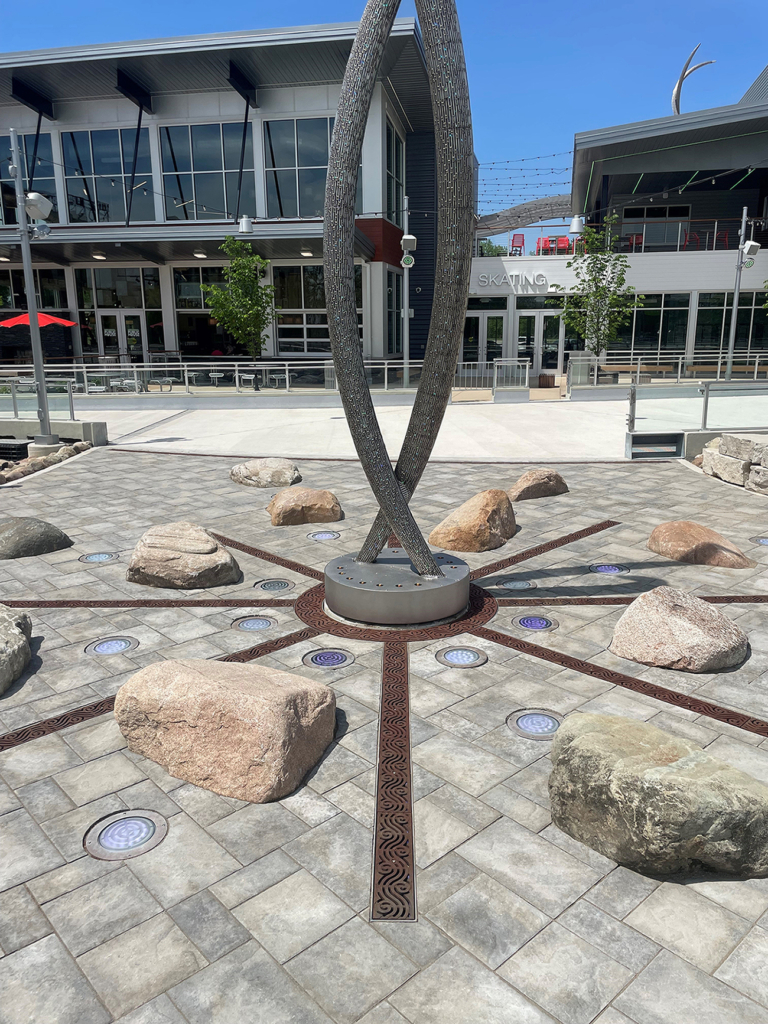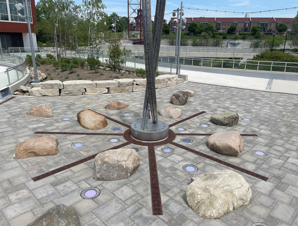 Argo 5″ x 20″ heel proof trench grate, cast ductile iron with our baked-on-oil finish. DESIGN: Context Design. PROJECT: Ironworks Plaza & Rink. LOCATION: Mishawaka, IN.