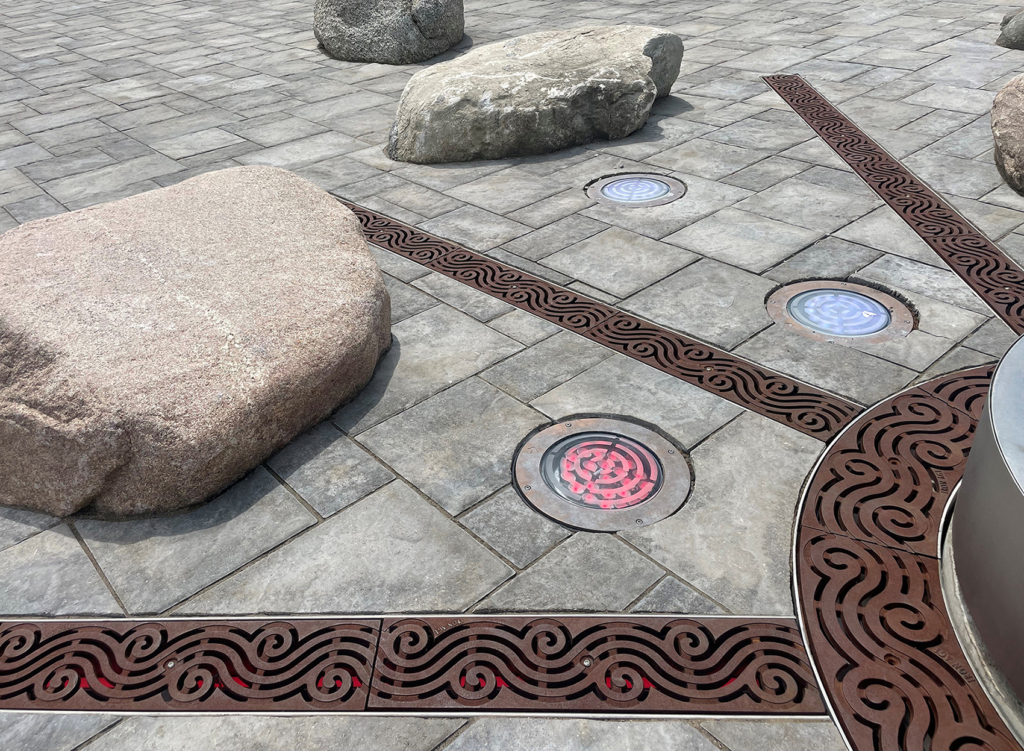 Argo 10″ x 20″ heavy-duty trench grate, raw cast iron. DESIGN: Munoz. INSTALLER: Sundt. PROJECT: San Pedro Creek Culture Park. LOCATION: San Antonio, TX.