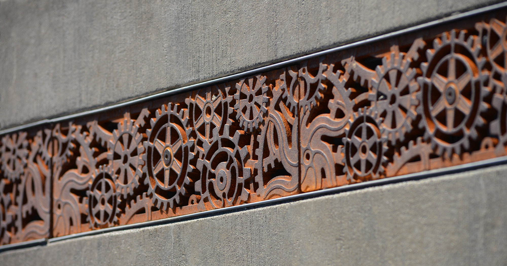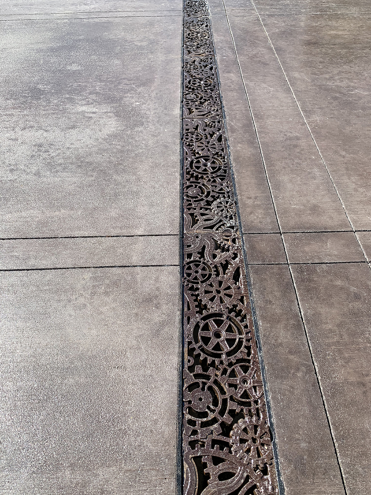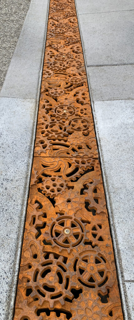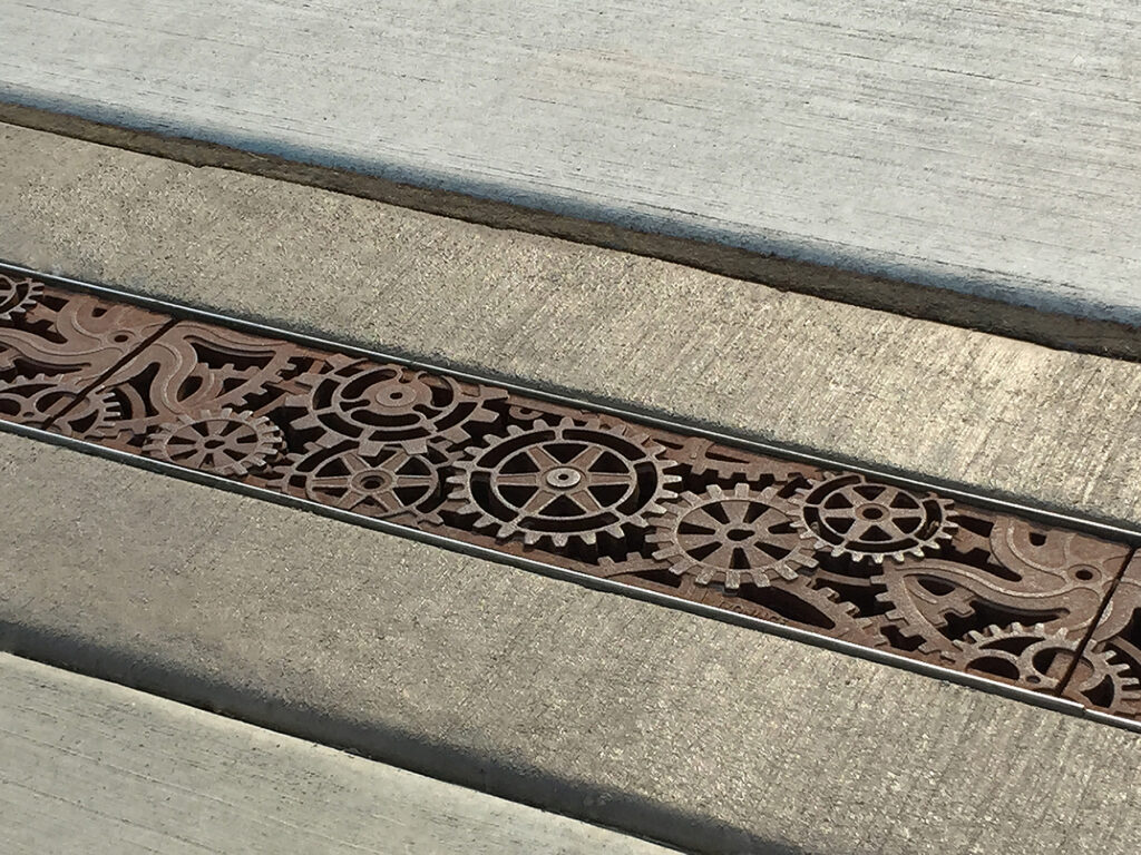 Dynamo 5″ x 20″ trench grate, raw cast ductile iron. DESIGN: Land Expressions. PROJECT: Huntington Park. LOCATION: Spokane, WA.