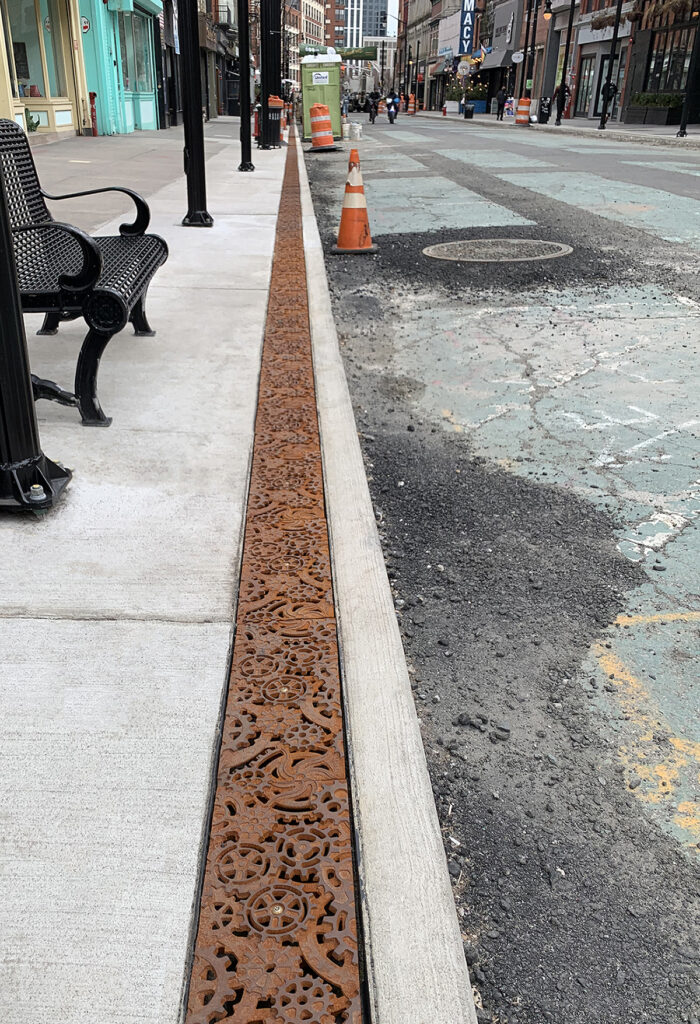 Dynamo 8″ x 20″ heavy-duty trench grates in raw cast ductile iron are installed next to a roadway being converted to a pedestrian plaza. DESIGN: Colliers Engineering & Design. INSTALLER: JC Contracting, Inc. PROJECT: Newark Avenue Pedestrian Mall. LOCATION: Jersey City, NJ.