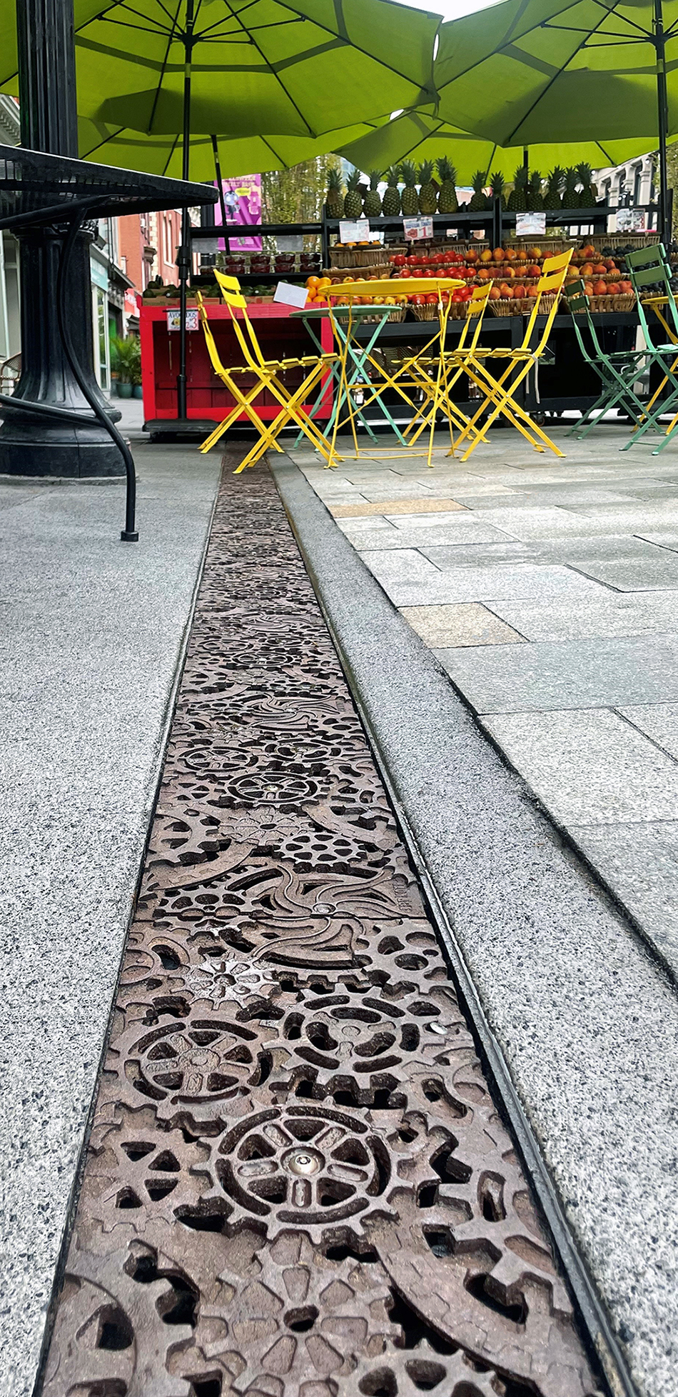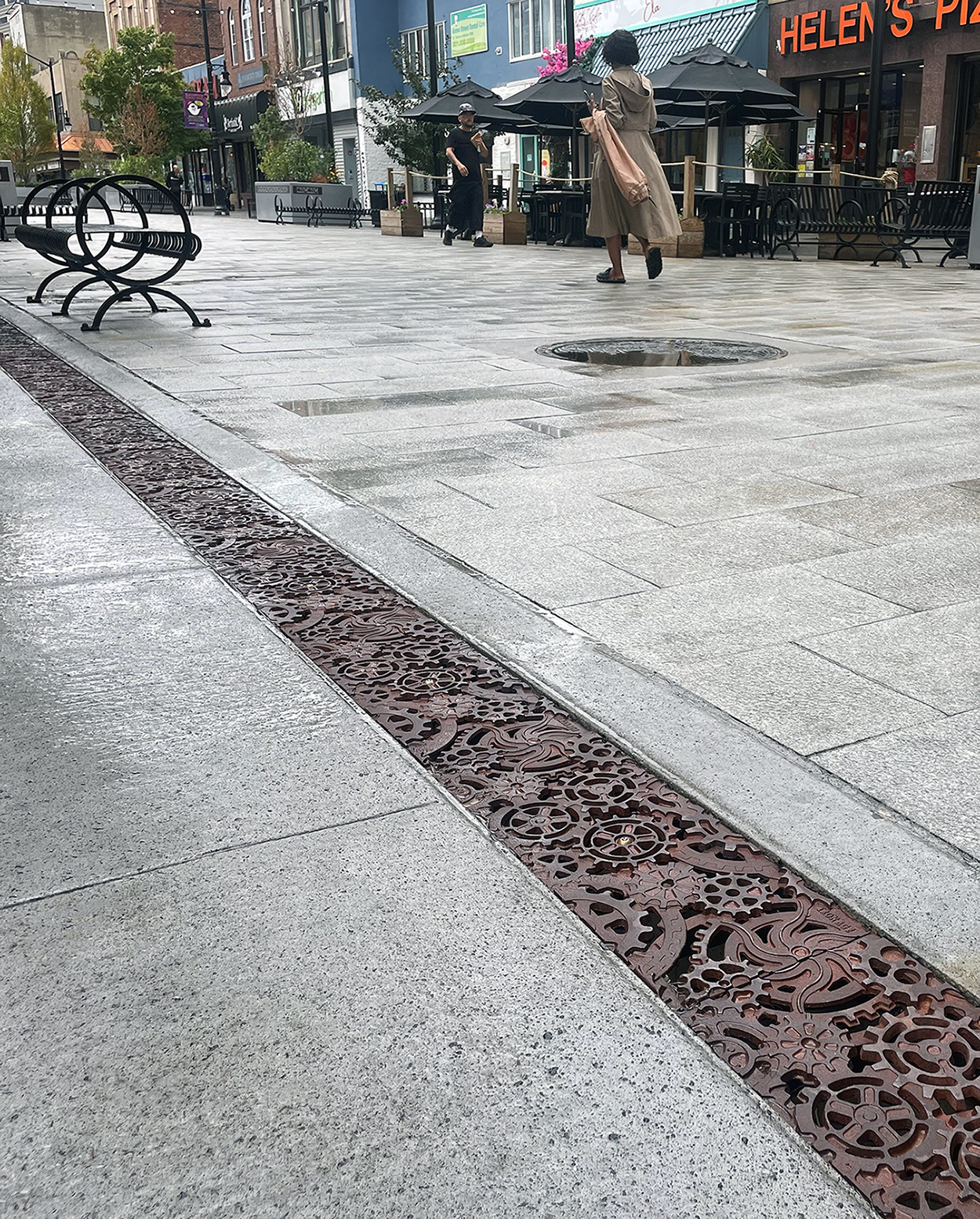Dynamo 8″ x 20″ heavy-duty trench grates in raw cast ductile iron are installed next to a roadway converted to a pedestrian plaza. DESIGN: Colliers Engineering & Design. INSTALLER: JC Contracting, Inc. PROJECT: Newark Avenue Pedestrian Mall. LOCATION: Jersey City, NJ.