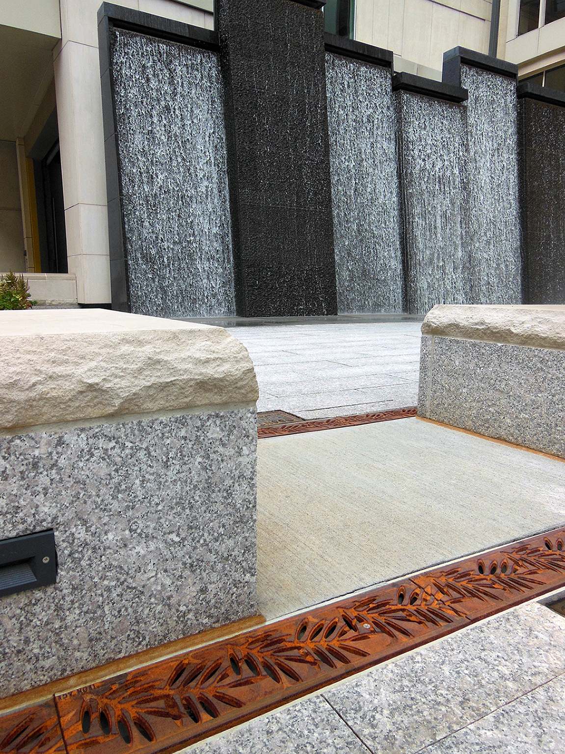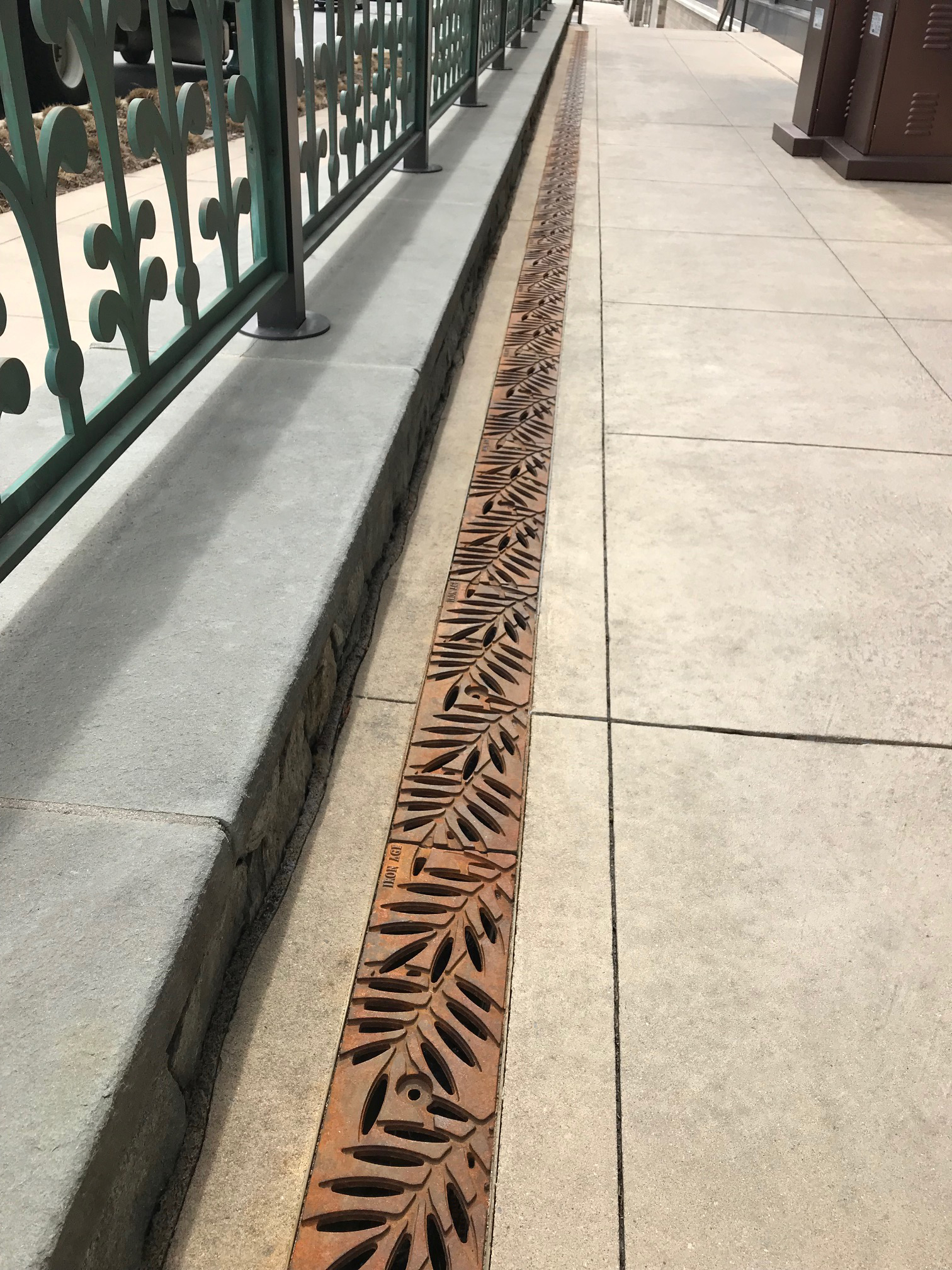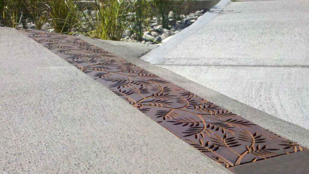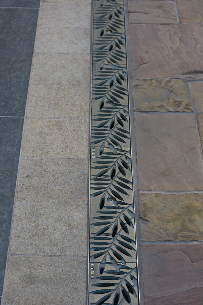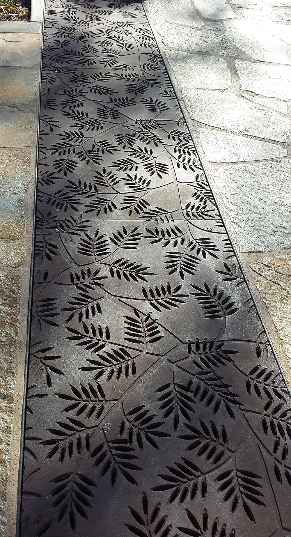 Locust 20″ x 40″ heel-proof trench grates, cast iron with baked-on-oil finish. Arrayed as a pedestrian bridge with decorative laser-cut hand rail.
