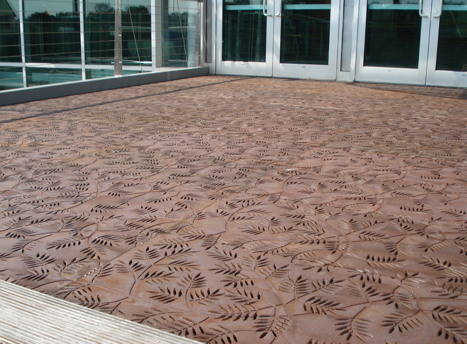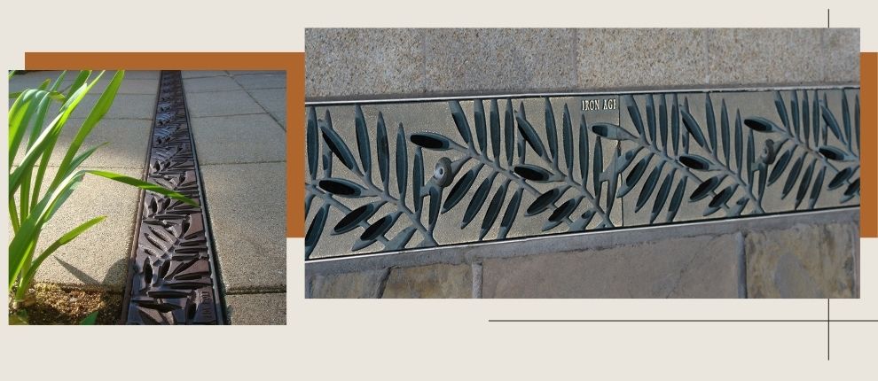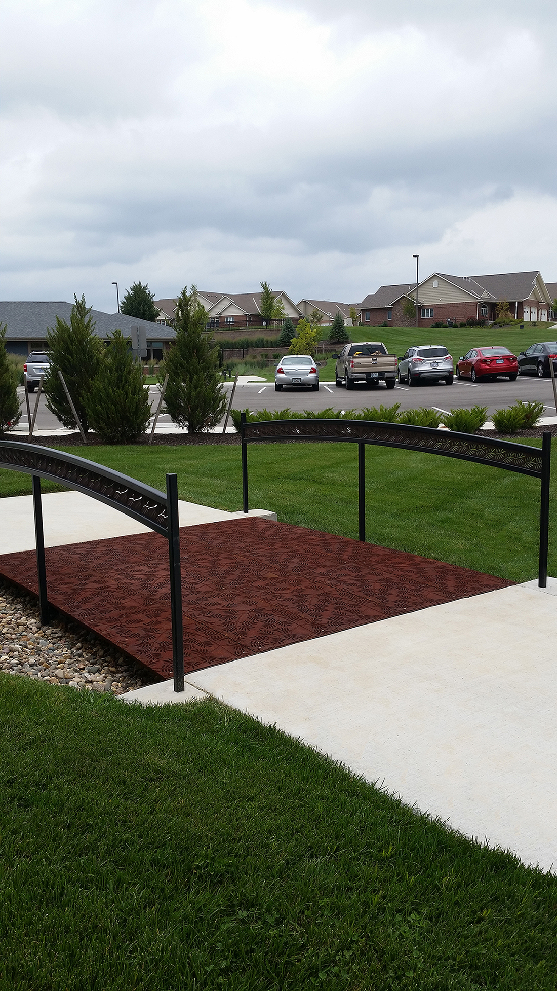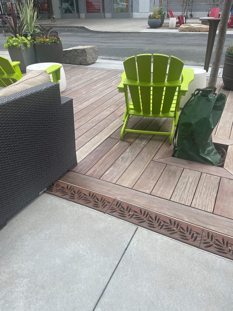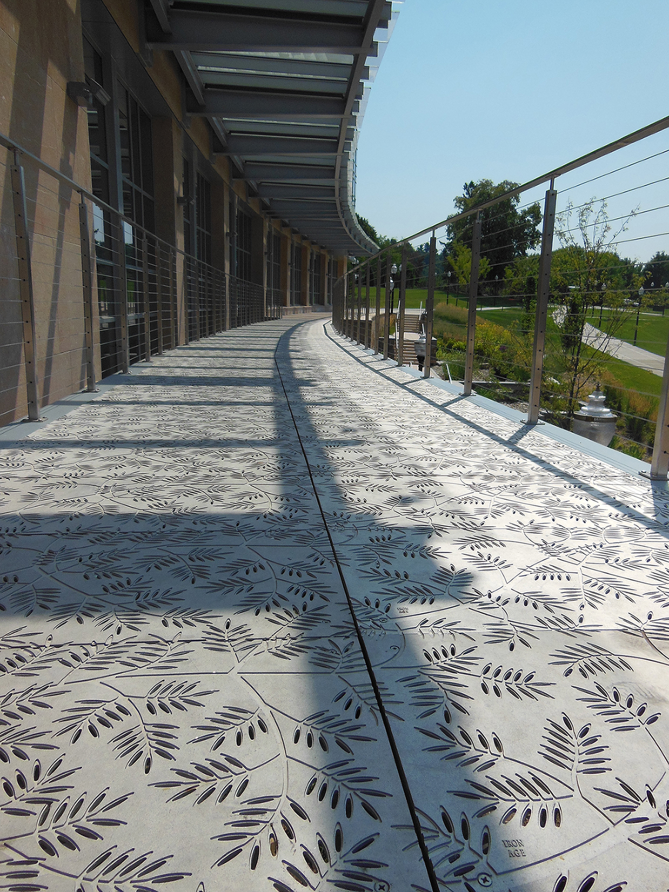 Locust 20″ x 40″ heel-proof trench grates, cast iron with baked-on-oil finish. Arrayed as a pedestrian bridge with decorative laser-cut hand rail.