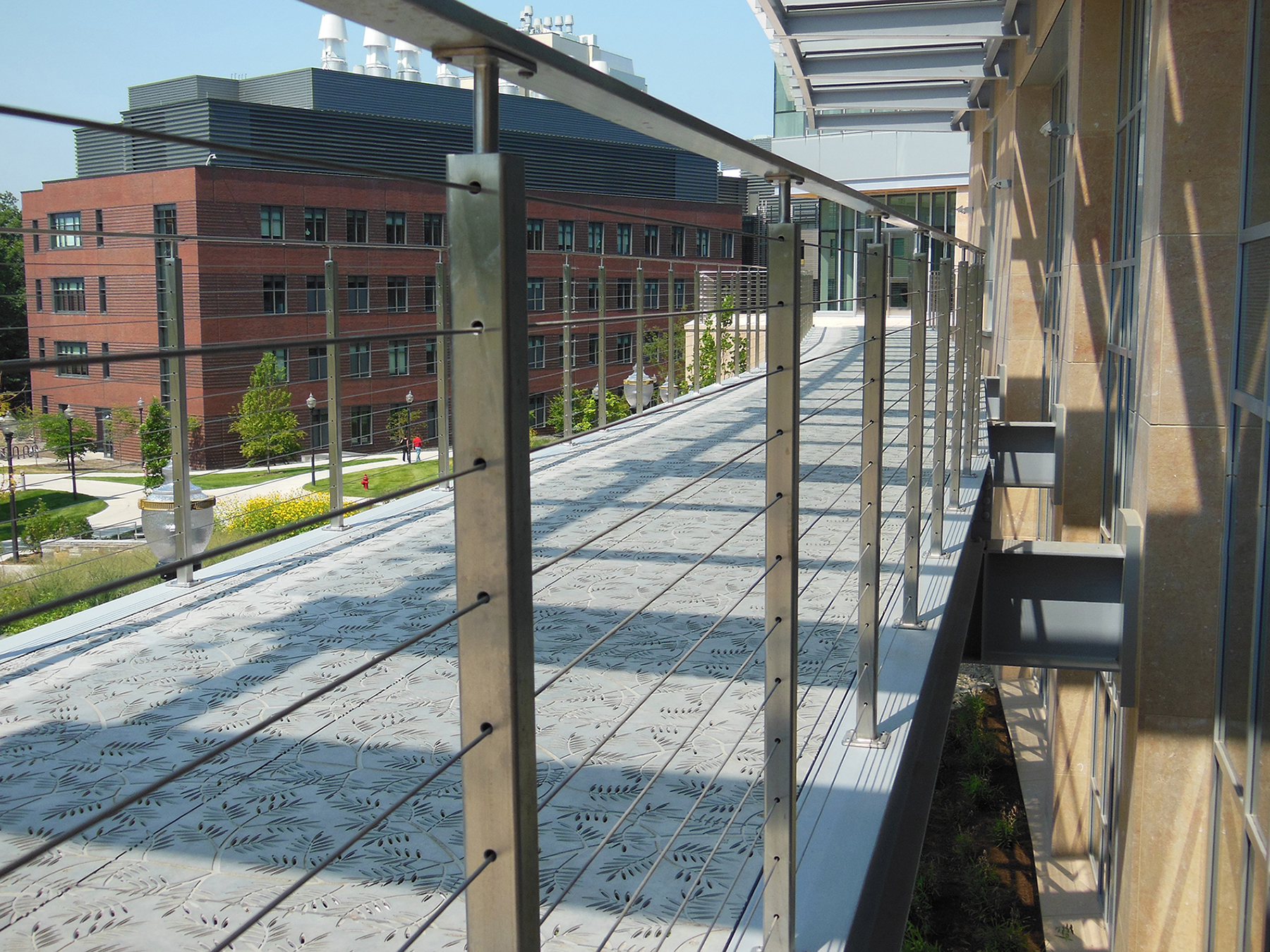 Locust 20″ x 40″ heel-proof trench grate, cast iron with baked-on-oil finish. Shown as pedestrian bridge deck. DESIGN: Hord Coplan Macht. PROJECT: Loyola University Baltimore Campus. LOCATION: Baltimore, MD.