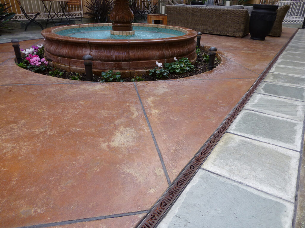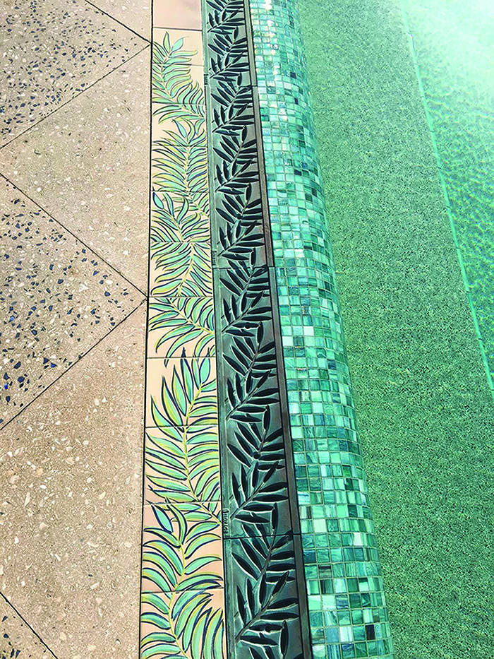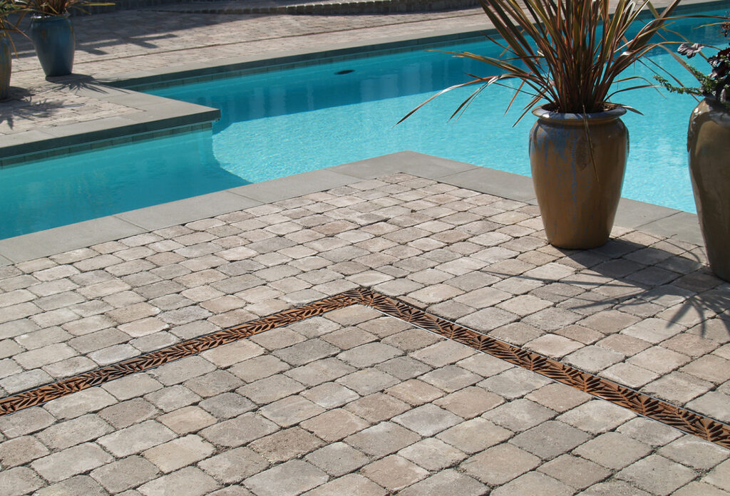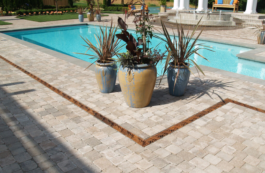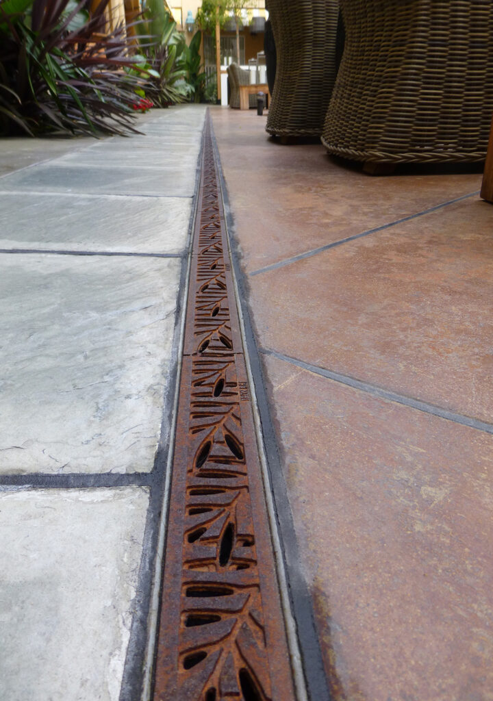 Locust 5″ x 20″ trench grate, raw cast bronze. PHOTO CREDIT/INSTALLER: Gulfstream Pools. PROJECT: Colony Hotel. LOCATION: Delray Beach, FL.