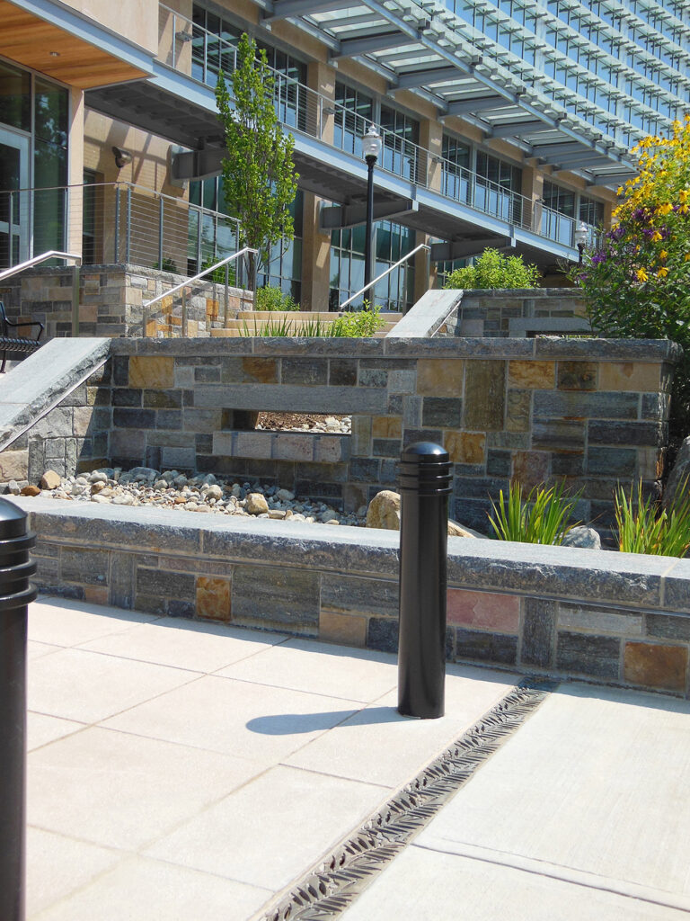Locust 20″ x 40″ heel-proof trench grate, raw cast aluminum, arrayed as a pedestrian bridge. LANDSCAPE ARCHITECT: Towers|Golde. PROJECT: Life Science Laboratories, University of Massachusetts – Amherst. LOCATION: Amherst, MA